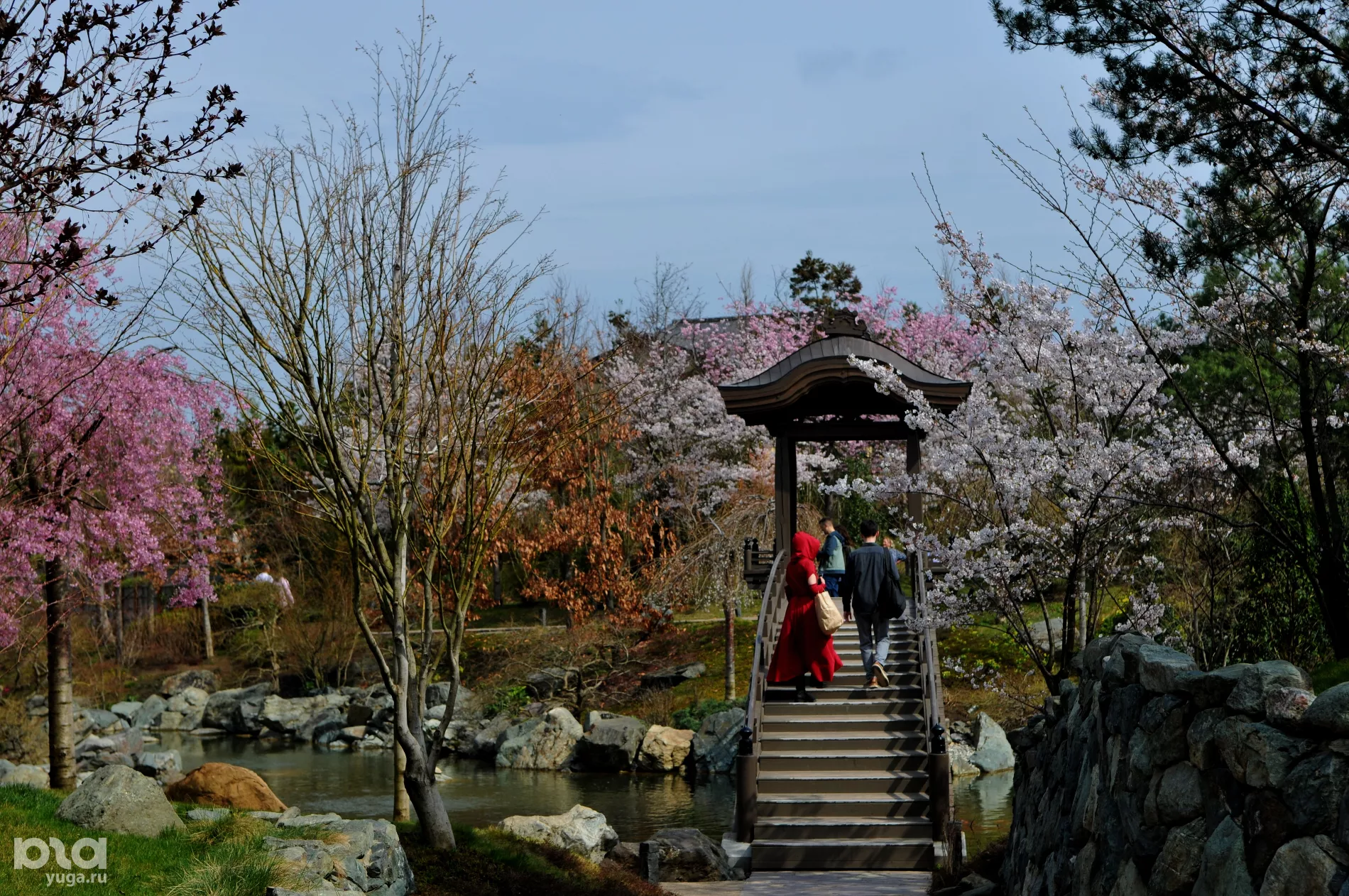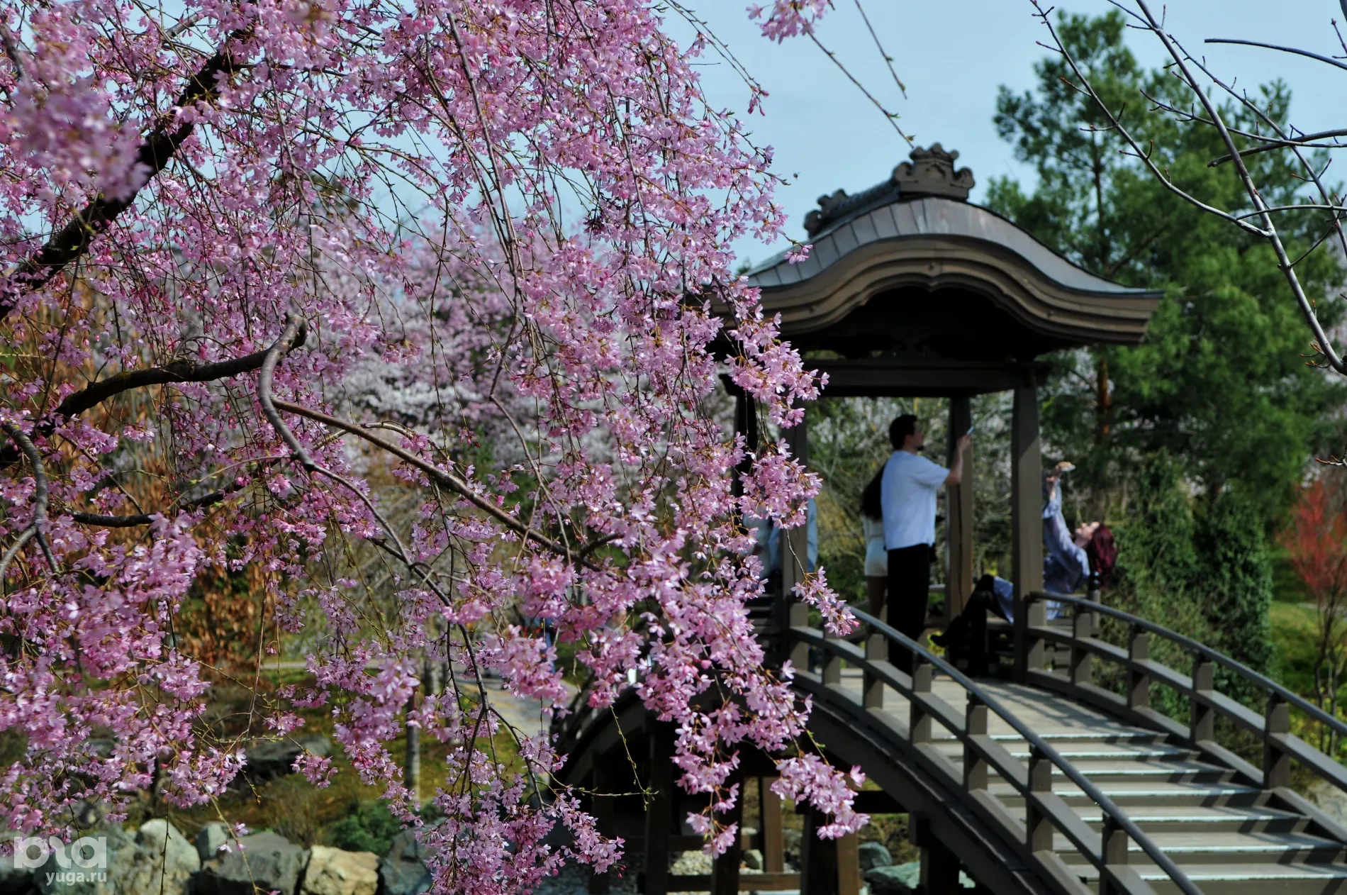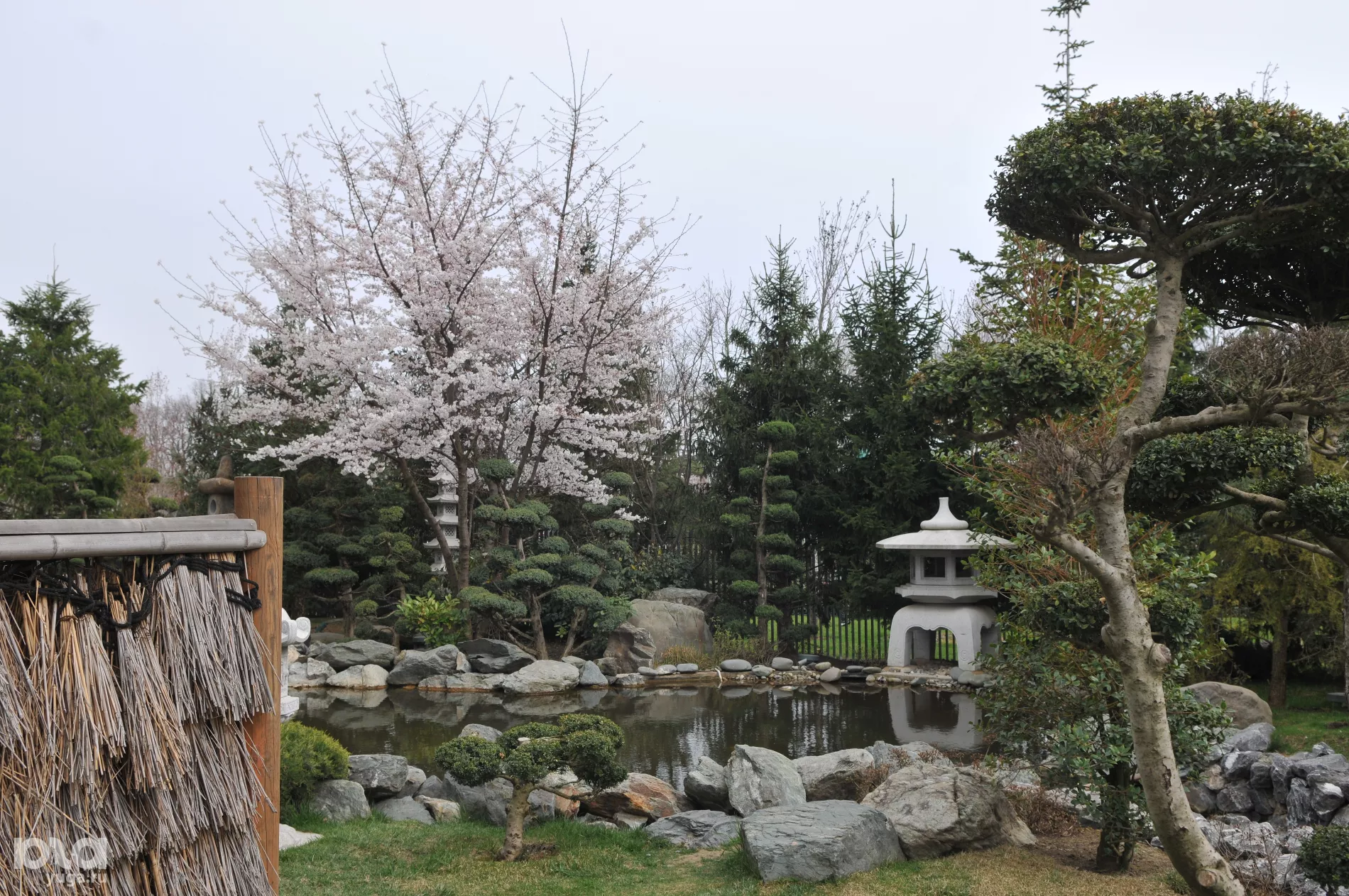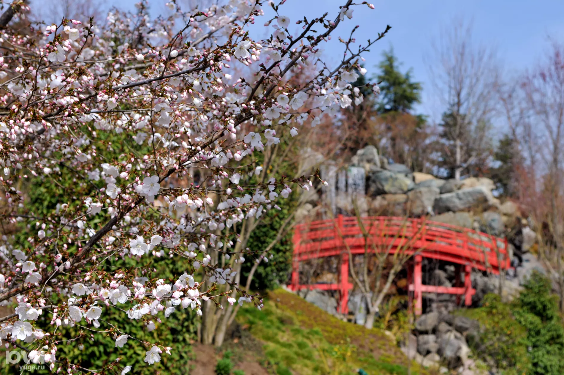 Весенние краски разлились по всей территории сада, оживляя японскую архитектуру.