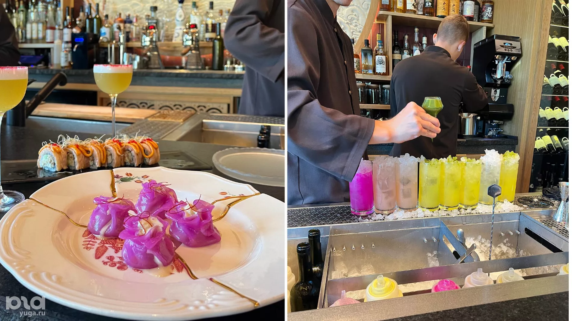 Кухню возглавляет Артём Недобежкин: его команда привозит из Японии устрицы Муроцу, голубого тунца чу-торо, говядину вагю и рис «косиибуки», который в суши-баре заменяют теплым каждые 15 минут. Десерты и закуски подают на посуде с золотыми «заплатками»: тарелки будто разбили и склеили заново. Это отсылка к кинцуги — старинной японской технике реставрации керамики, где изъяны становятся неотъемлемой частью истории предмета. В 2026 году заведение забралось на 49-ю строчку международного рейтинга WhereToEat.