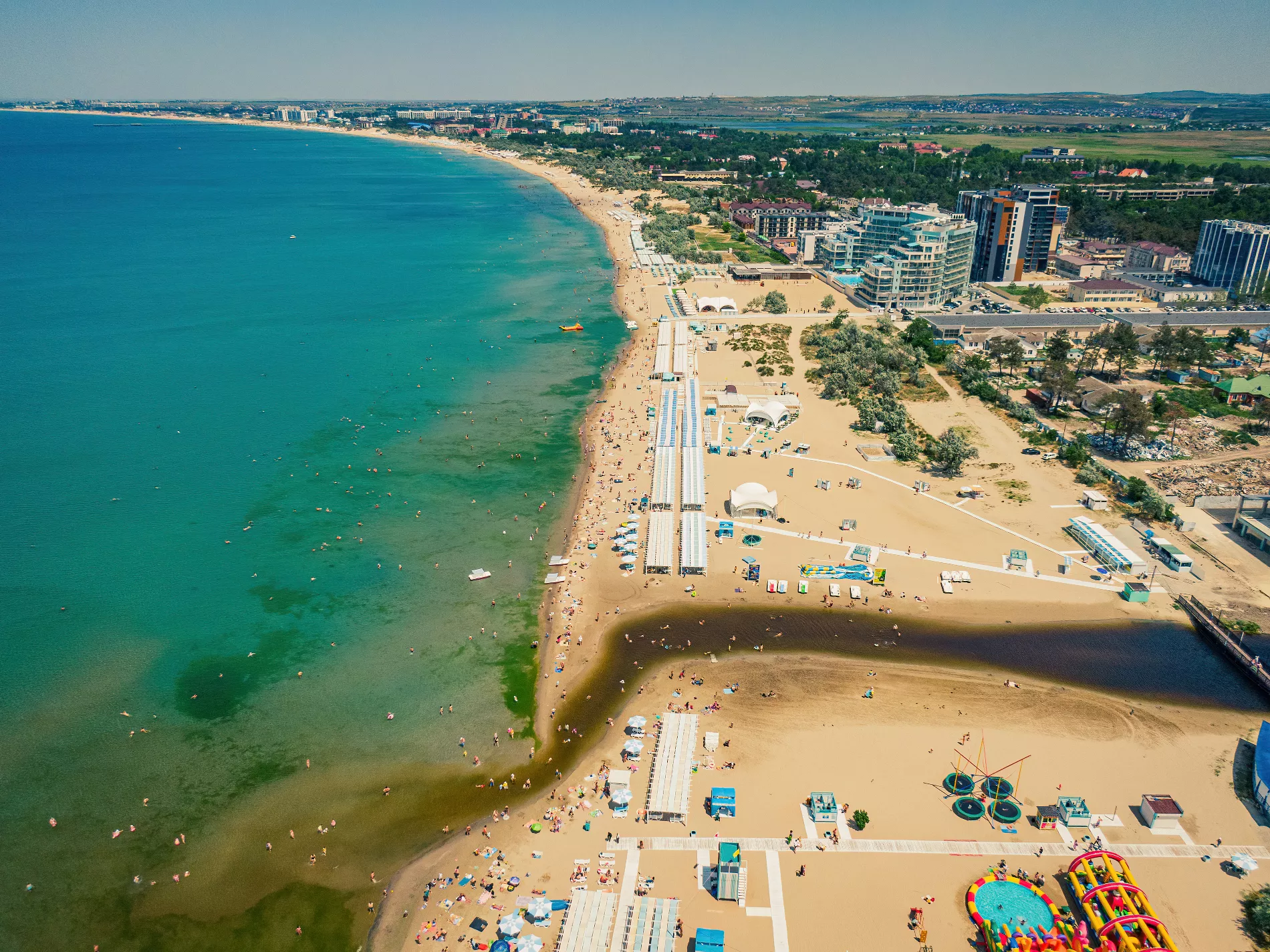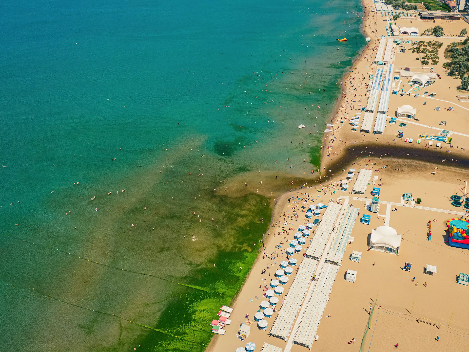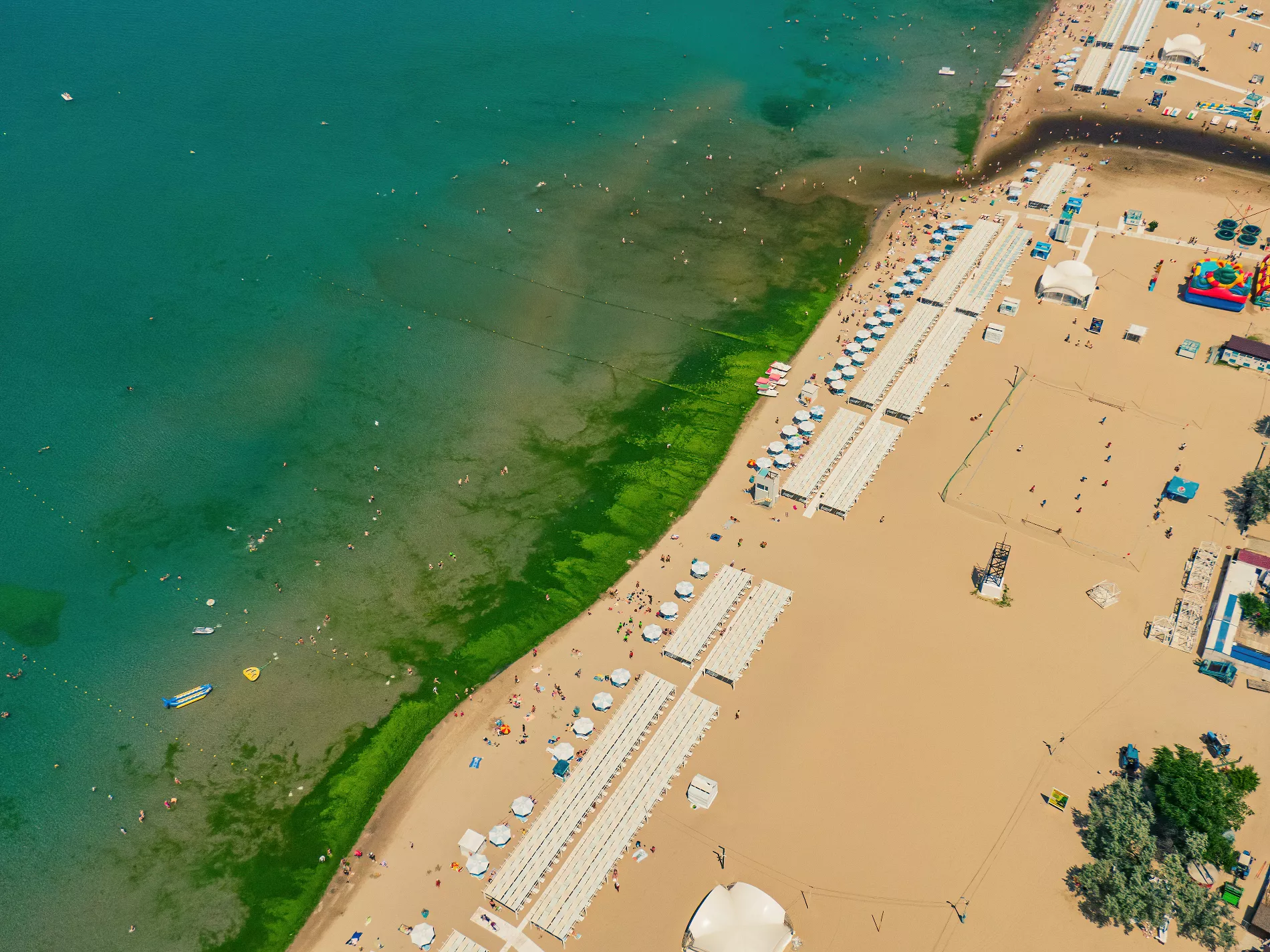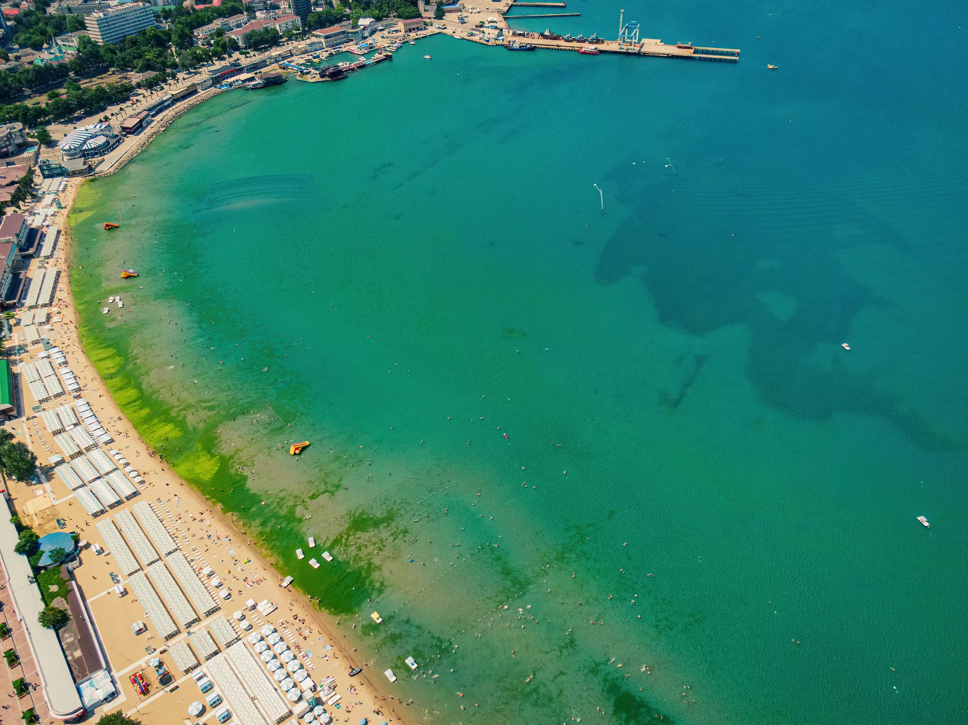 Вообще при взгляде сверху анапский пляж так и пестрит яркими цветами. И напоминает государственный флаг то ли Танзании, то ли Ямайки. Тропически яркую зелень цветущих водорослей в какой-то момент разбавляет черный акцент — в том месте, где в море впадает река Анапка.