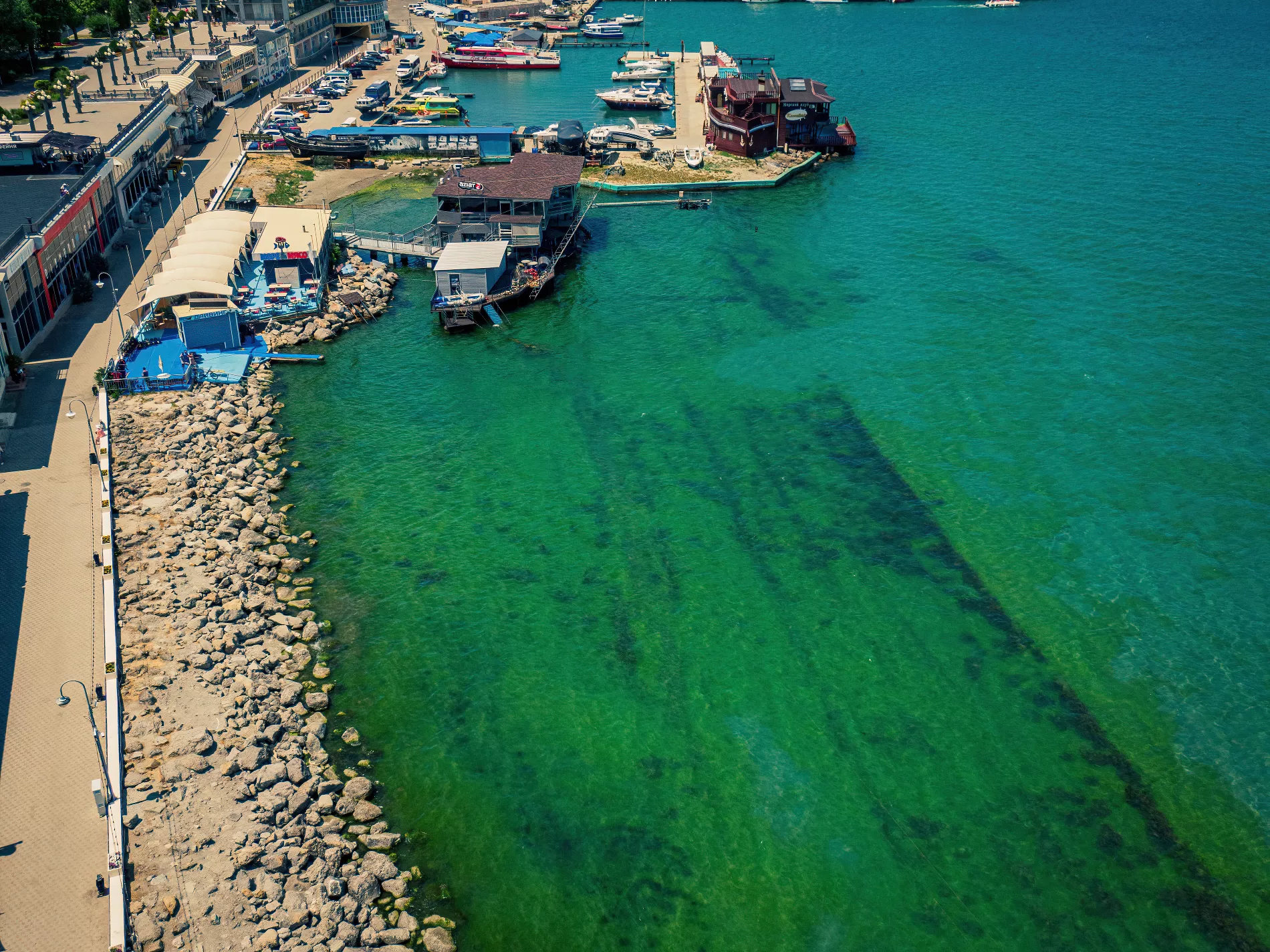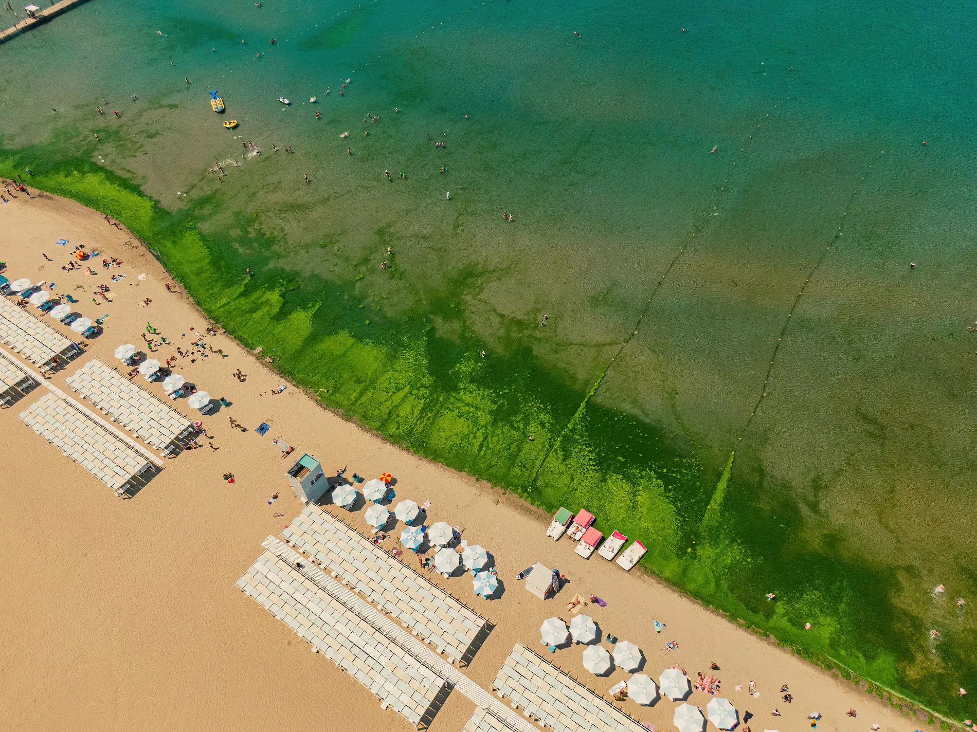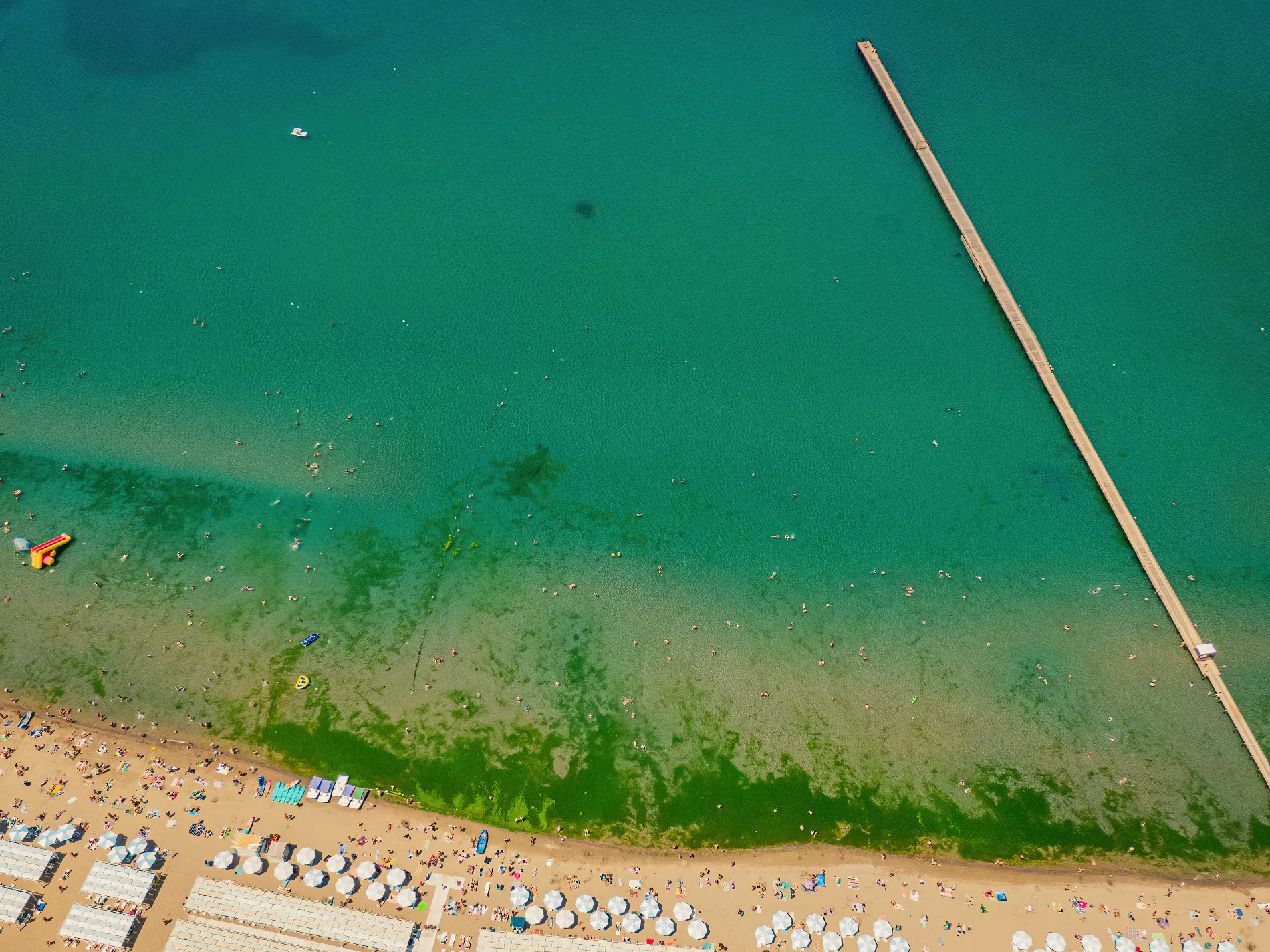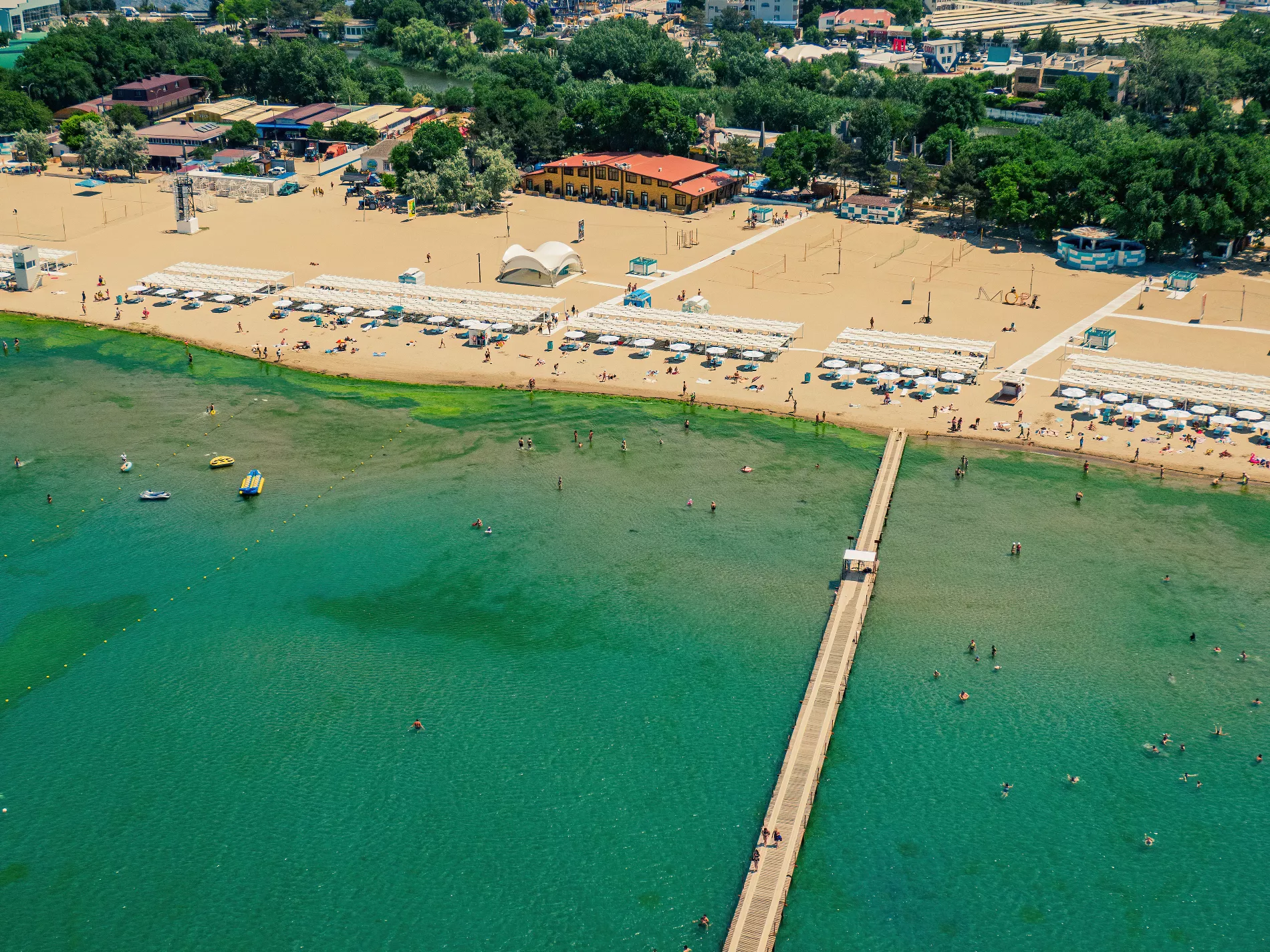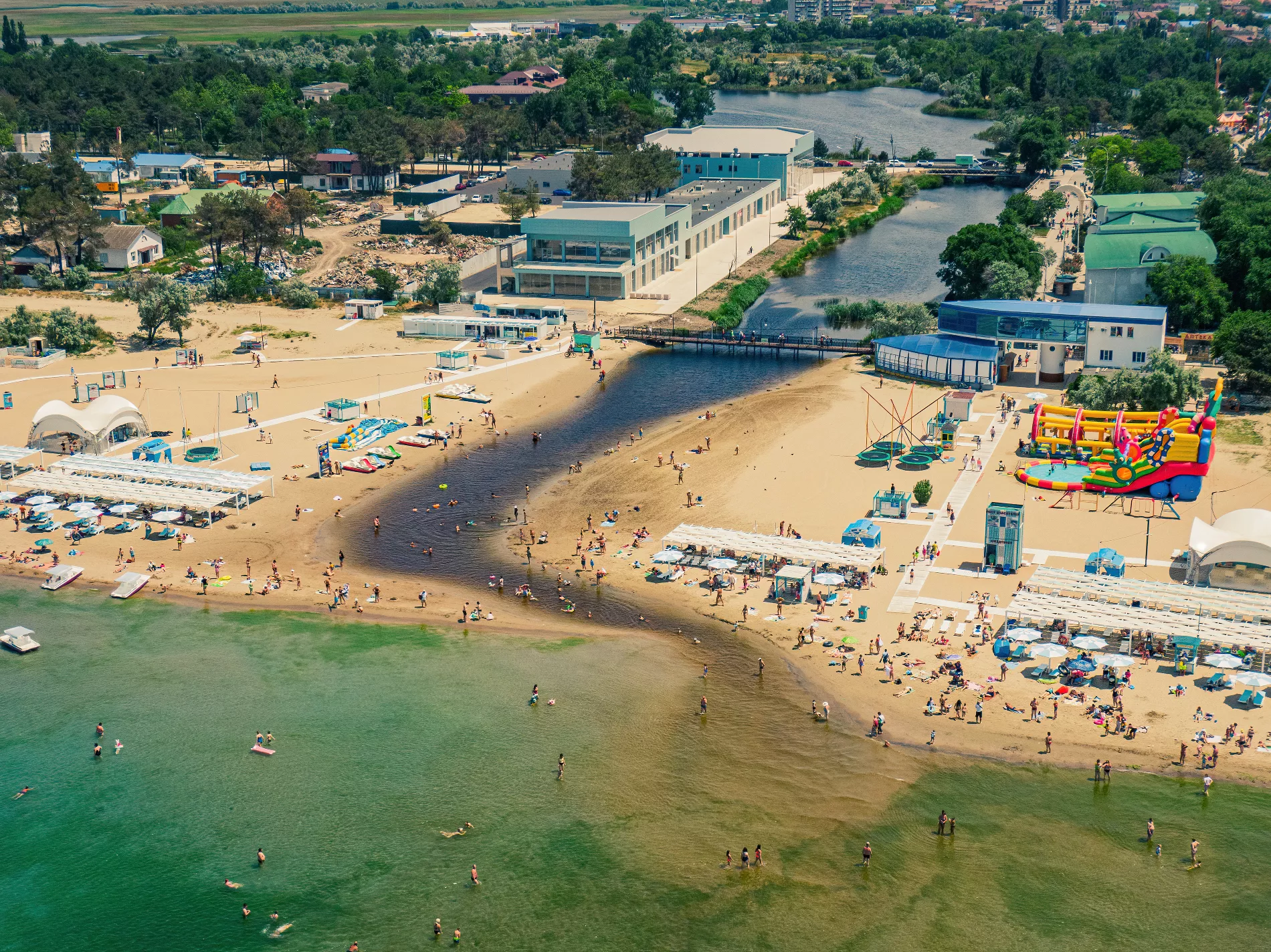 Вообще при взгляде сверху анапский пляж так и пестрит яркими цветами. И напоминает государственный флаг то ли Танзании, то ли Ямайки. Тропически яркую зелень цветущих водорослей в какой-то момент разбавляет черный акцент — в том месте, где в море впадает река Анапка.
