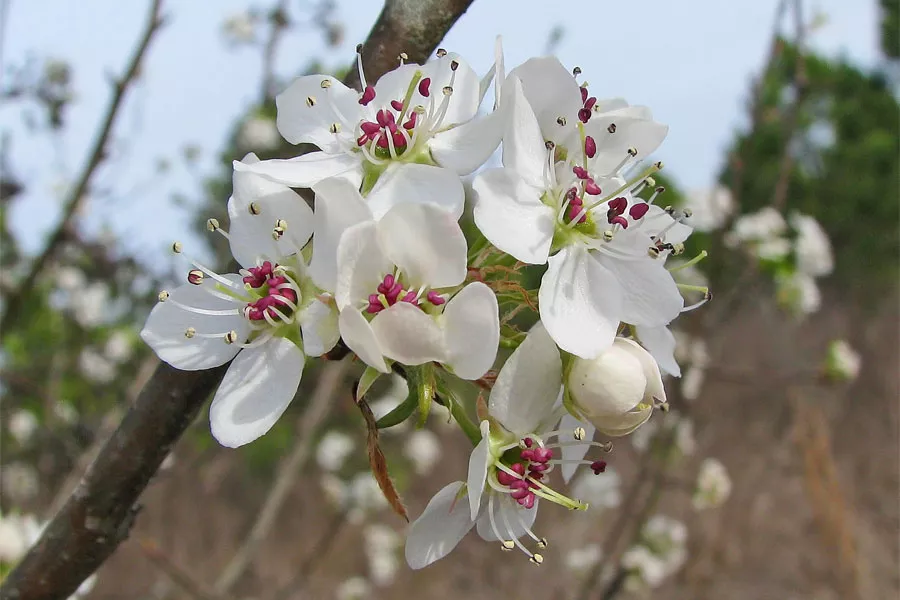 В середине апреля — начале мая эффектно зацветают дикие груши, яблони. Это невысокие деревья, в основном они растут по опушкам леса, где больше света. Но иногда их можно найти и в самом лесу. Они растут практически везде. Если повезет, можно встретить и дикую черешню (вишню птичью). Цветет она так же, как и садовая черешня, но растет не везде.