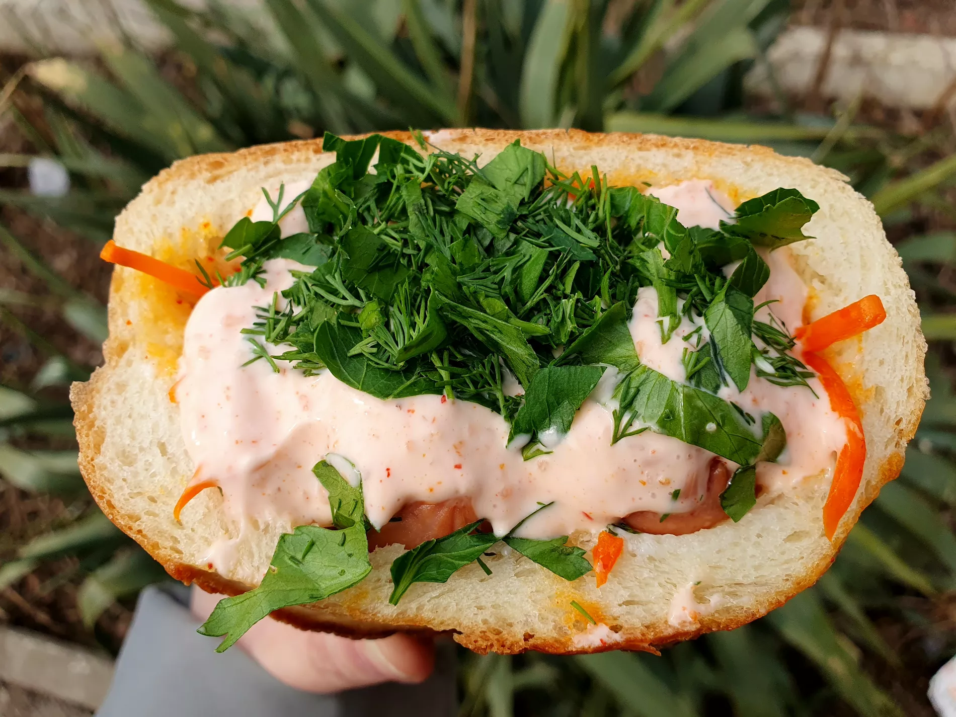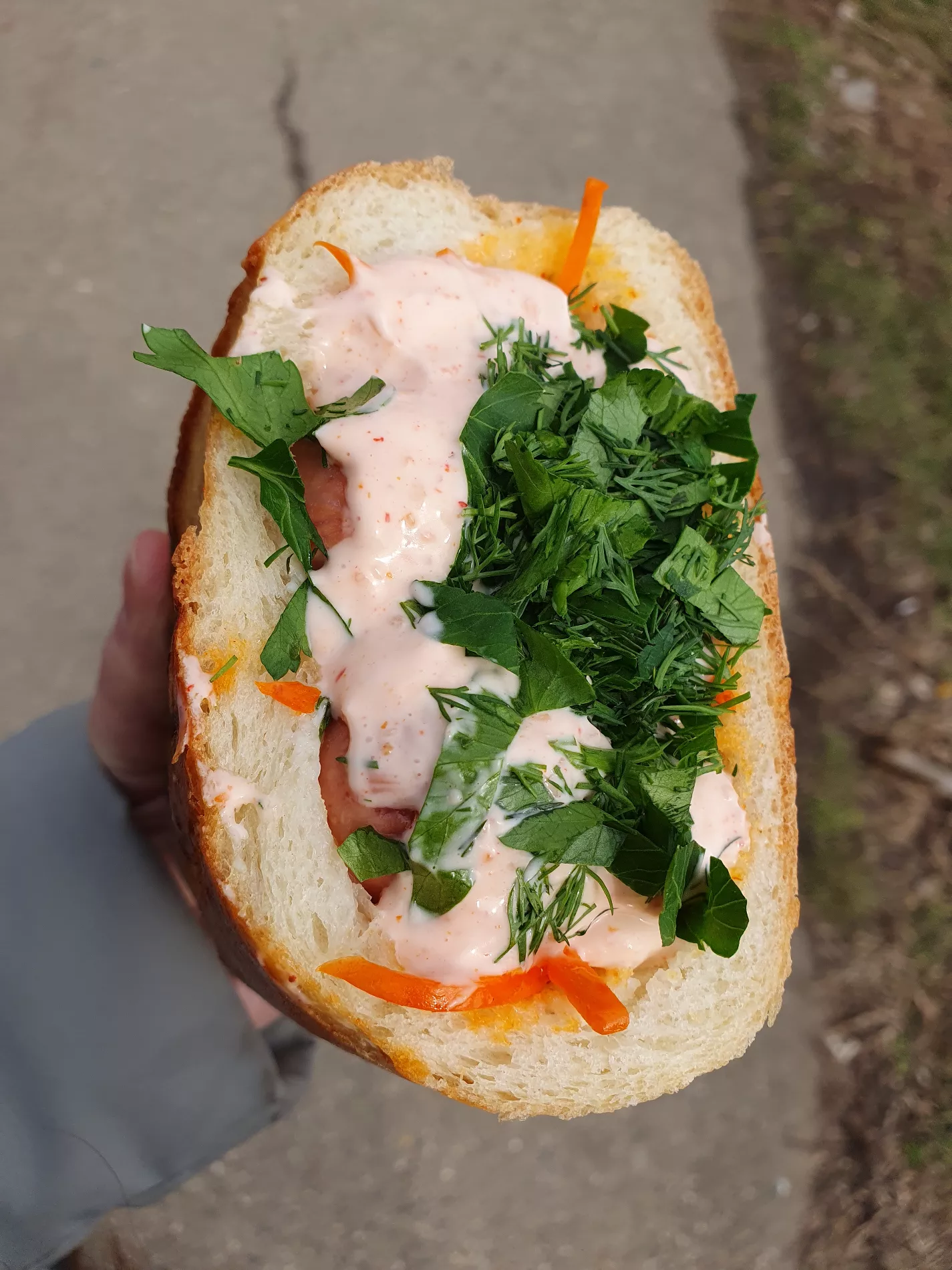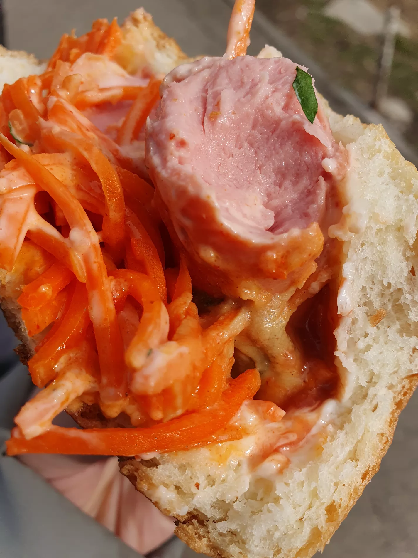 Блюдо снаружи: горячая, хрустящая, и, что немаловажно, герметичная горбушка под шапочкой из соуса и свежей зелени. Внутри — классическое комбо студенческого стритфуда: две ганноверские сосиски, в меру острая горчица, маринованные огурцы, морковь по-корейски и много красного соуса. Все ингредиенты кажутся очень свежими, а начинка равномерно попадается до самого дна батона.
