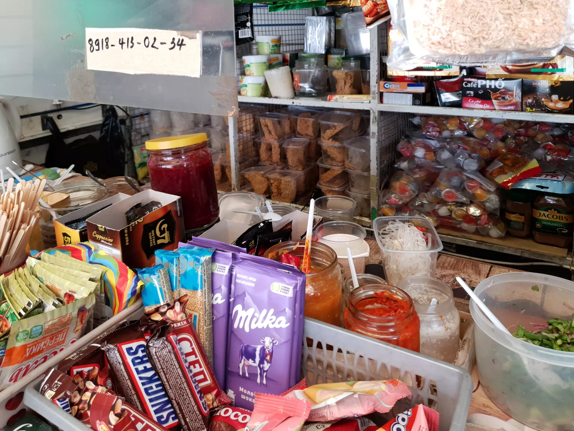 На полках посреди хаоса из пакетов с мини-желе и картонных коробок стоят заготовки будущего супа в пластиковых боксах — рисовая и яичная лапша с сухими специями. Тхи Кха встречает нас улыбкой и на ломаном русском пытается помочь с выбором. Можно взять просто фо — суп с лапшой без мяса (маленькая порция — 100 рублей, большая — 150). Если добавить в суп кусочки говядины, выйдет фо-бо, если курицы — фо-га. Маленькая порция супа с мясом стоит 150 рублей, большая — 200.