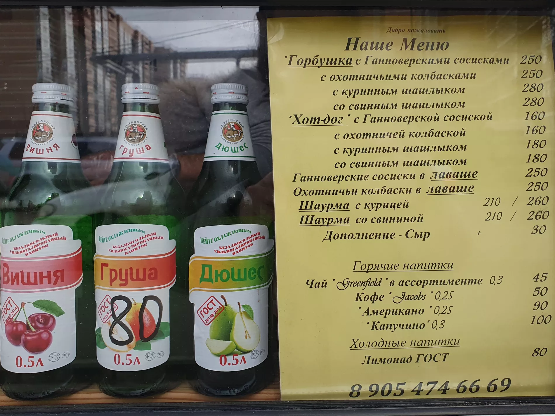 Стоимость горбушки — 250 рублей, капучино — 50. За ту же цену можно взять горбушку с охотничьими колбасками, а за 280 — с куриным или свиным шашлыком. Еще в меню есть хот-доги с теми же вариантами начинок, сосиски и колбаски в лаваше и шаурма.