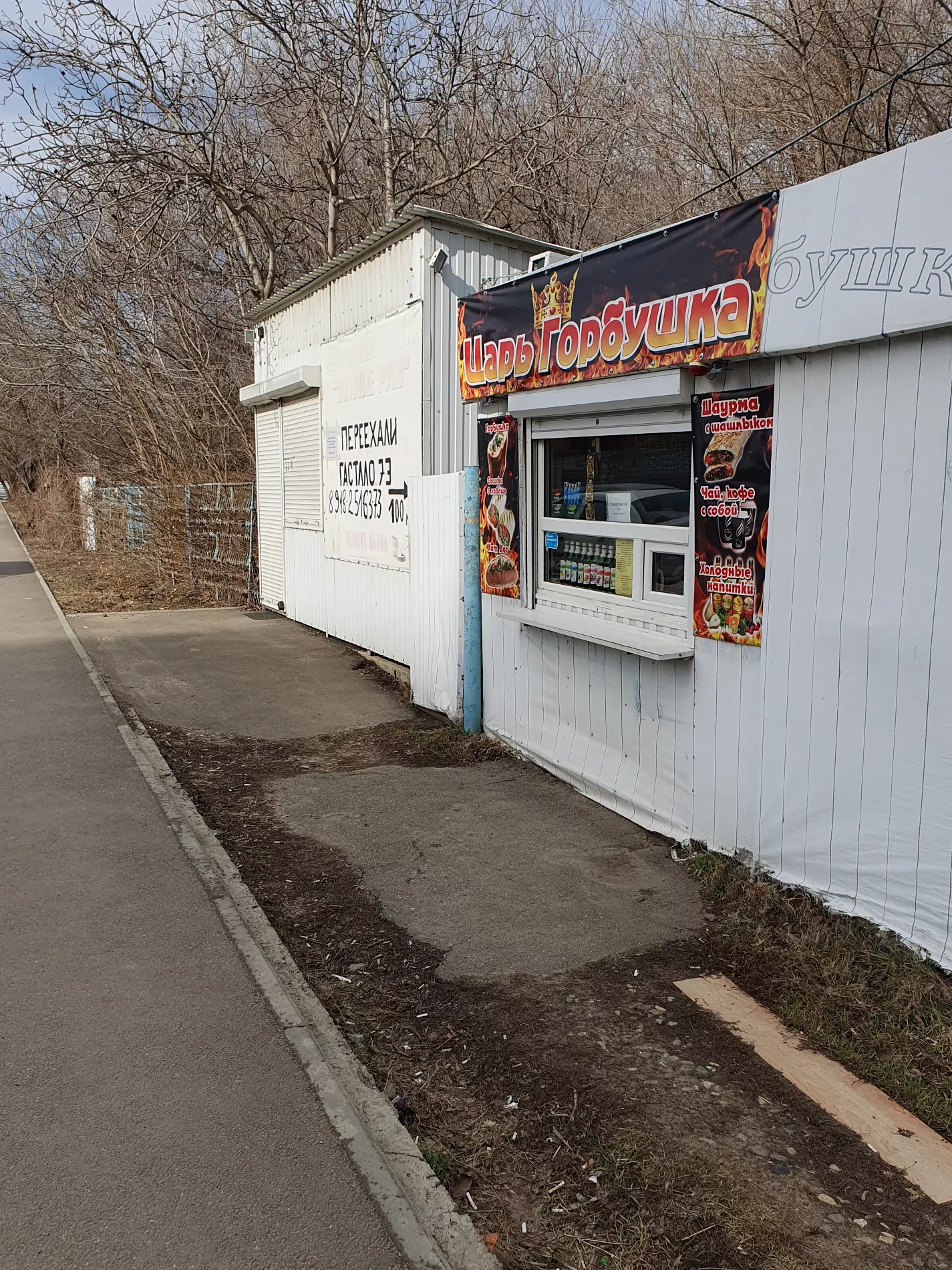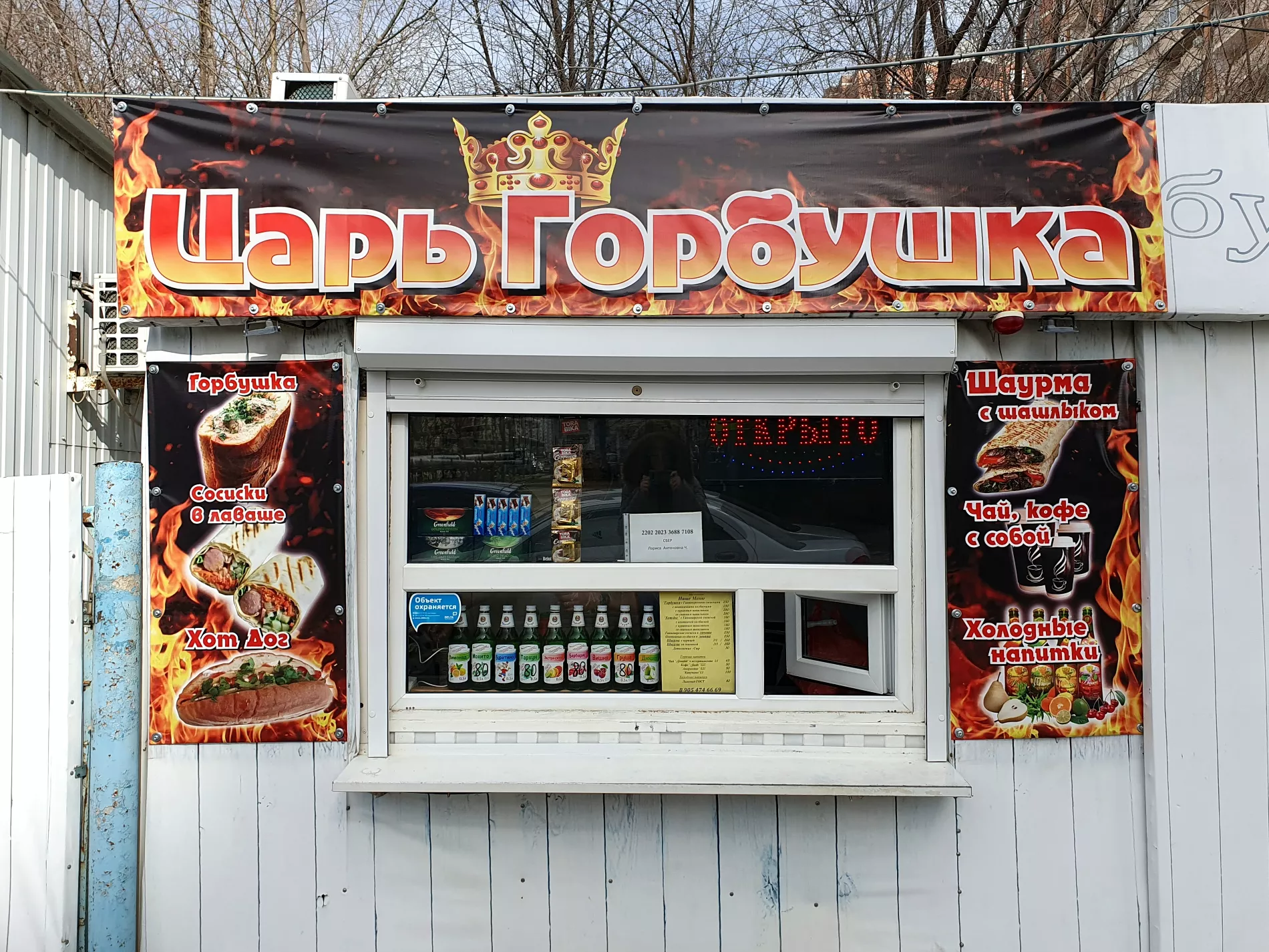 24 февраля светодиодная табличка «Открыто» в окне придорожного ларька с горбушкой загорается только в начале 12-го. Пока разогревается печь, хозяин рассказывает: всем своим [постоянным покупателям] перед праздниками разослал сообщения о времени работы, вчера был выходной, а сегодня вышел к 11. Минут через 20 первый на сегодня заказ в заведении — горбушка и растворимый капучино — готов. Дядя Саша улыбается, желает приятного аппетита, а за ожидание угощает шоколадным батончиком.