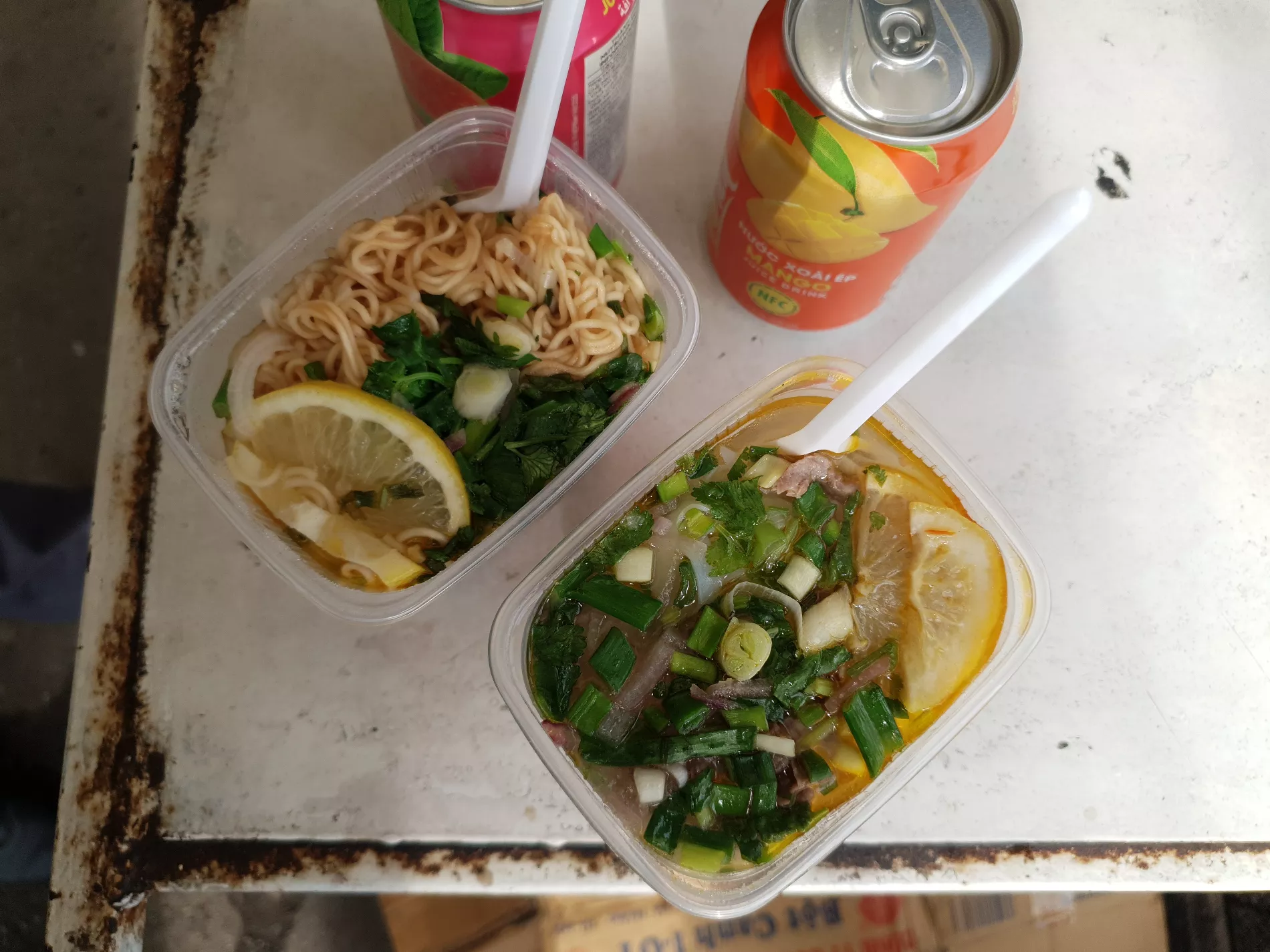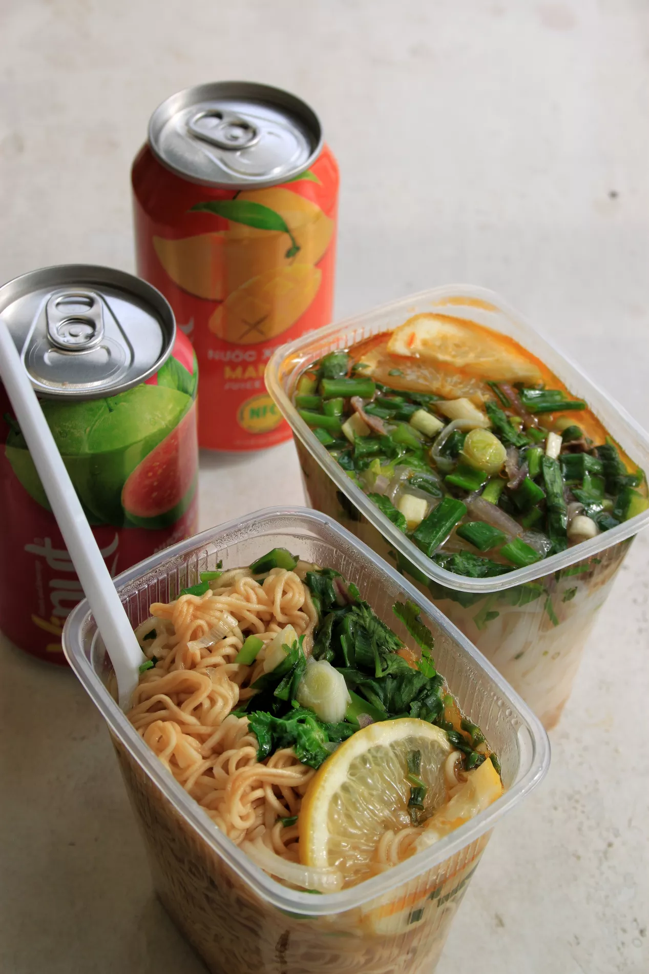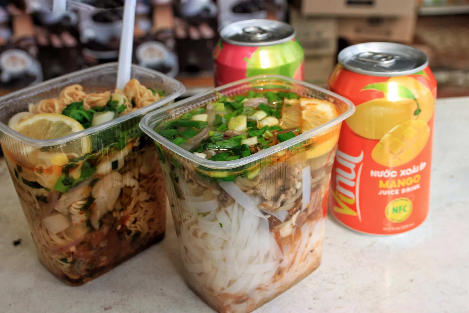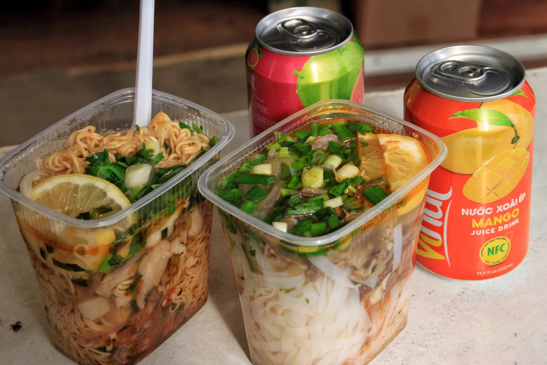 Берем две маленькие порции — фо-бо с рисовой лапшой и фо-га с яичной — плюс два напитка со вкусом манго и гуавы в жестяной банке (по 100 рублей каждый), все вместе выходит 500 рублей.