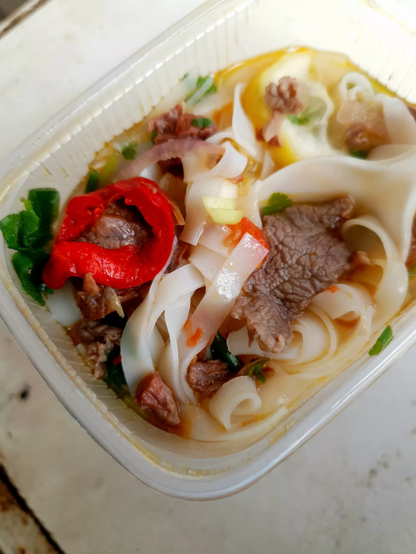 Тхи Кха добавляет в контейнер с лапшой тонко нарезанные кусочки говядины и курицы, острый соус (шрирача), квашеный острый перец, креветочную соль, специи, рубленую зелень, дольки лимона и заваривает все это кипятком.