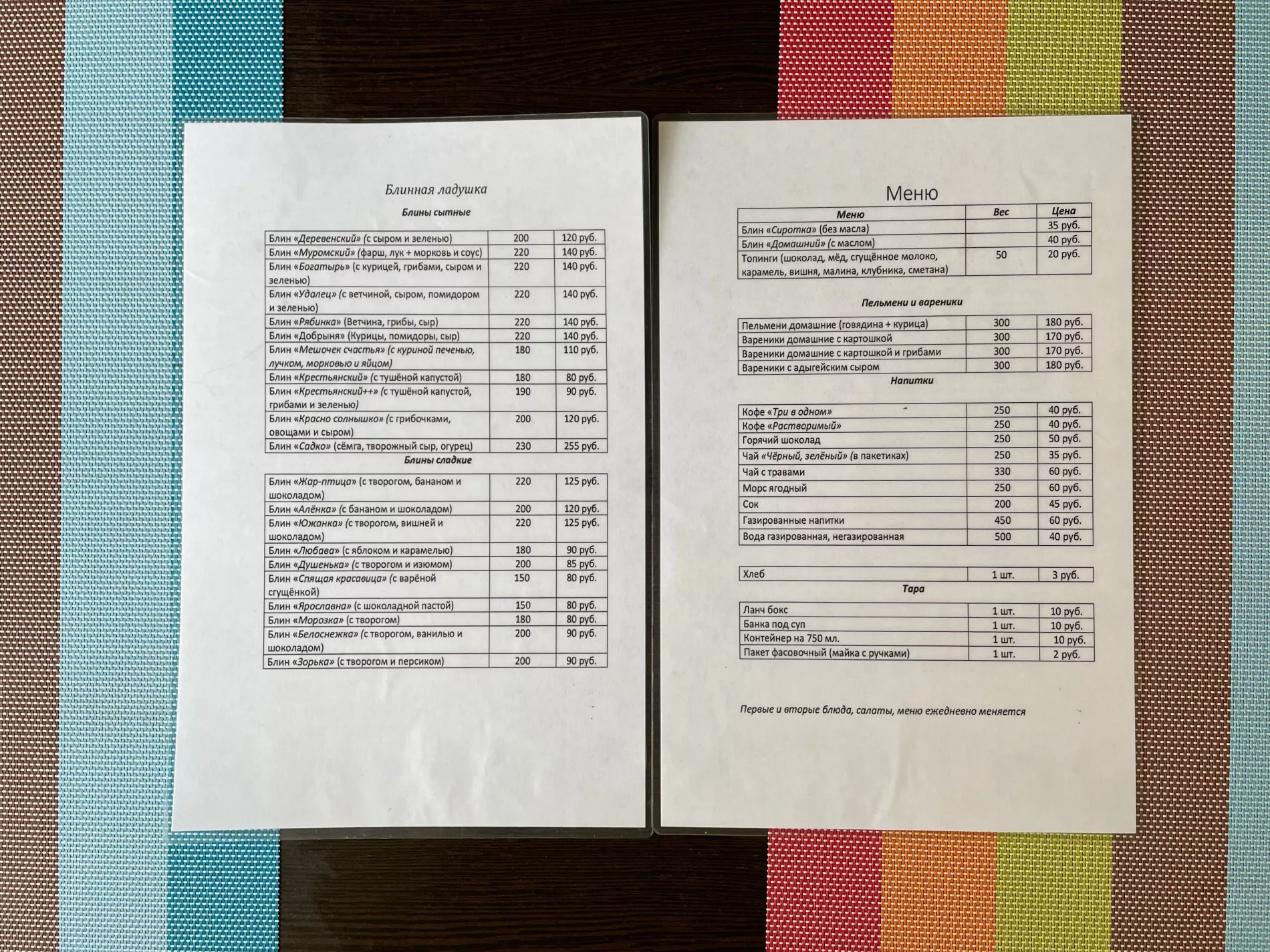 Кроме блинов, здесь готовят пельмени и вареники. А еще — первое, второе и салаты, их меню ежедневно меняется.