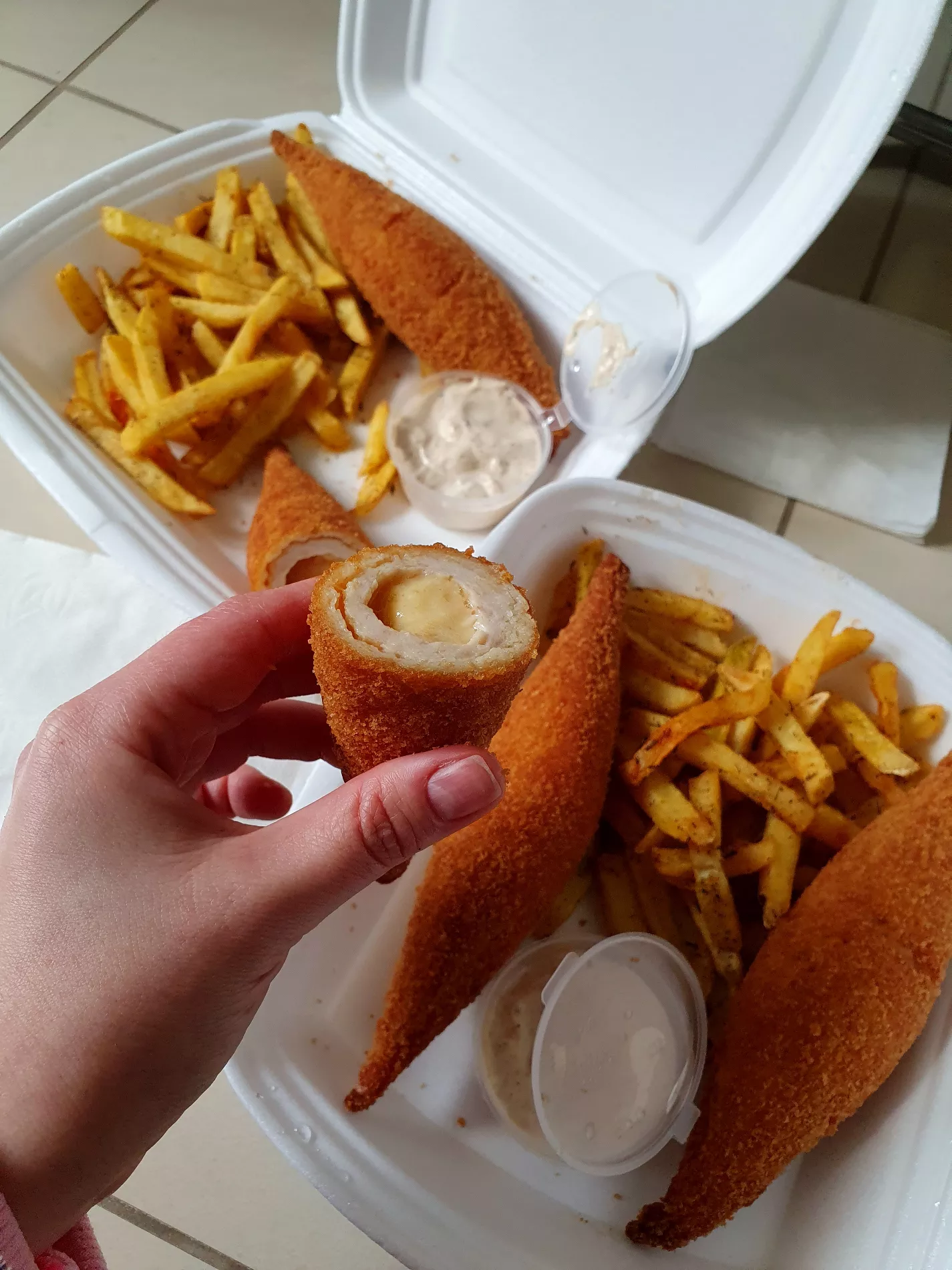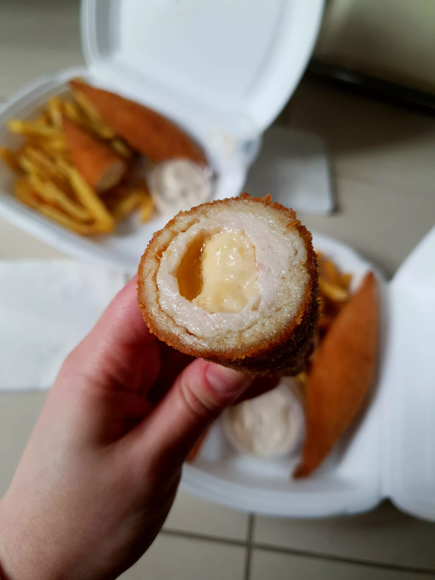 Из сердцевины за прошедшие с покупки 4 часа не вытекли ни масло, ни сыр, мясо осталось сочным, а панировка не обмокла.