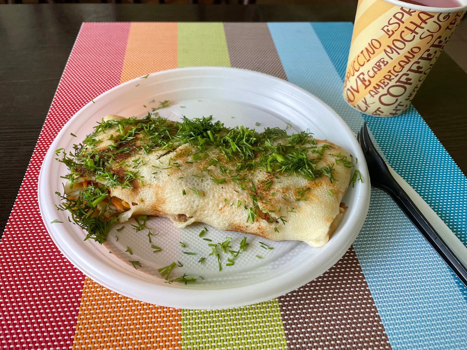 Наш заказ: блин «Муромский» с начинкой из фарша, лука, моркови и [неизвестного] соуса (140 рублей) и ягодный морс (60 рублей).
