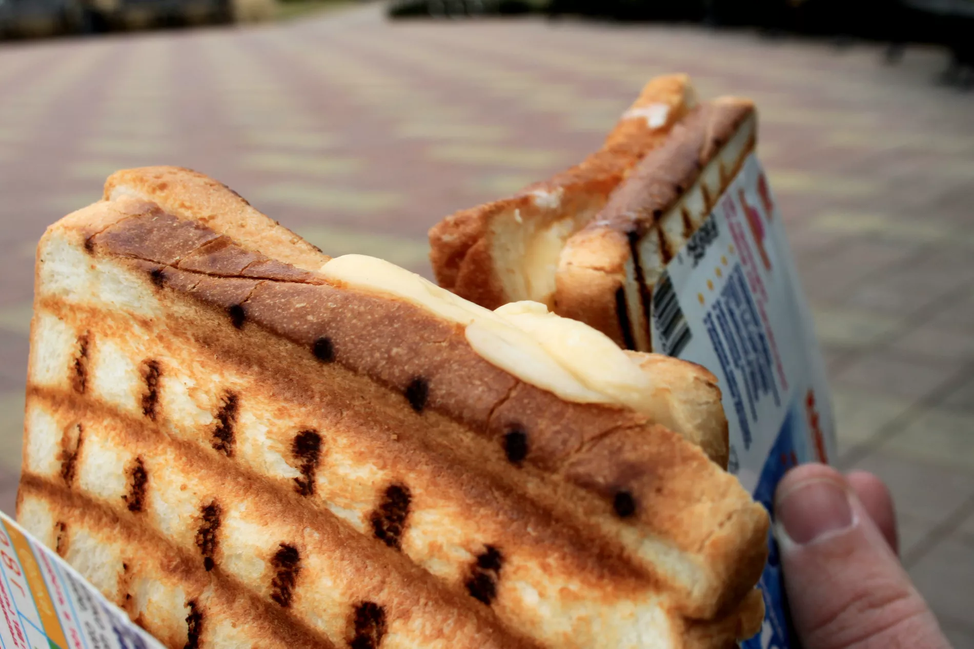 Состав единственного блюда в меню простой и беспроигрышный: два куска подрумяненного тостового хлеба, два сыра — плавленый и твердый, кусок докторской колбасы и сливочно-чесночный соус. Стоимость — 80 рублей. Есть сэндвичи на месте, в узком торговом ряду, неудобно, поэтому мы донесли их до Вишняковского сквера.