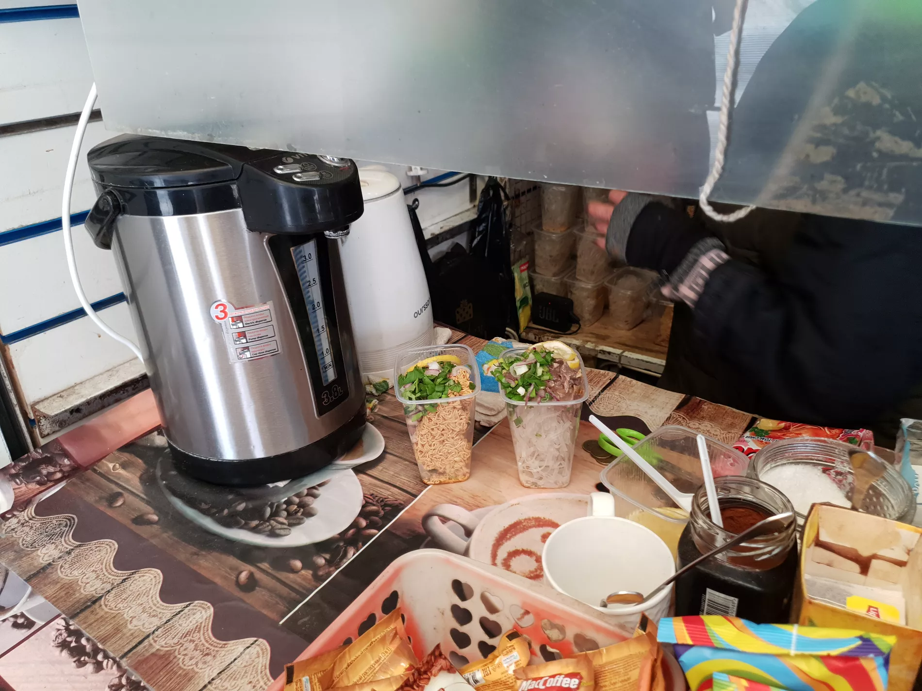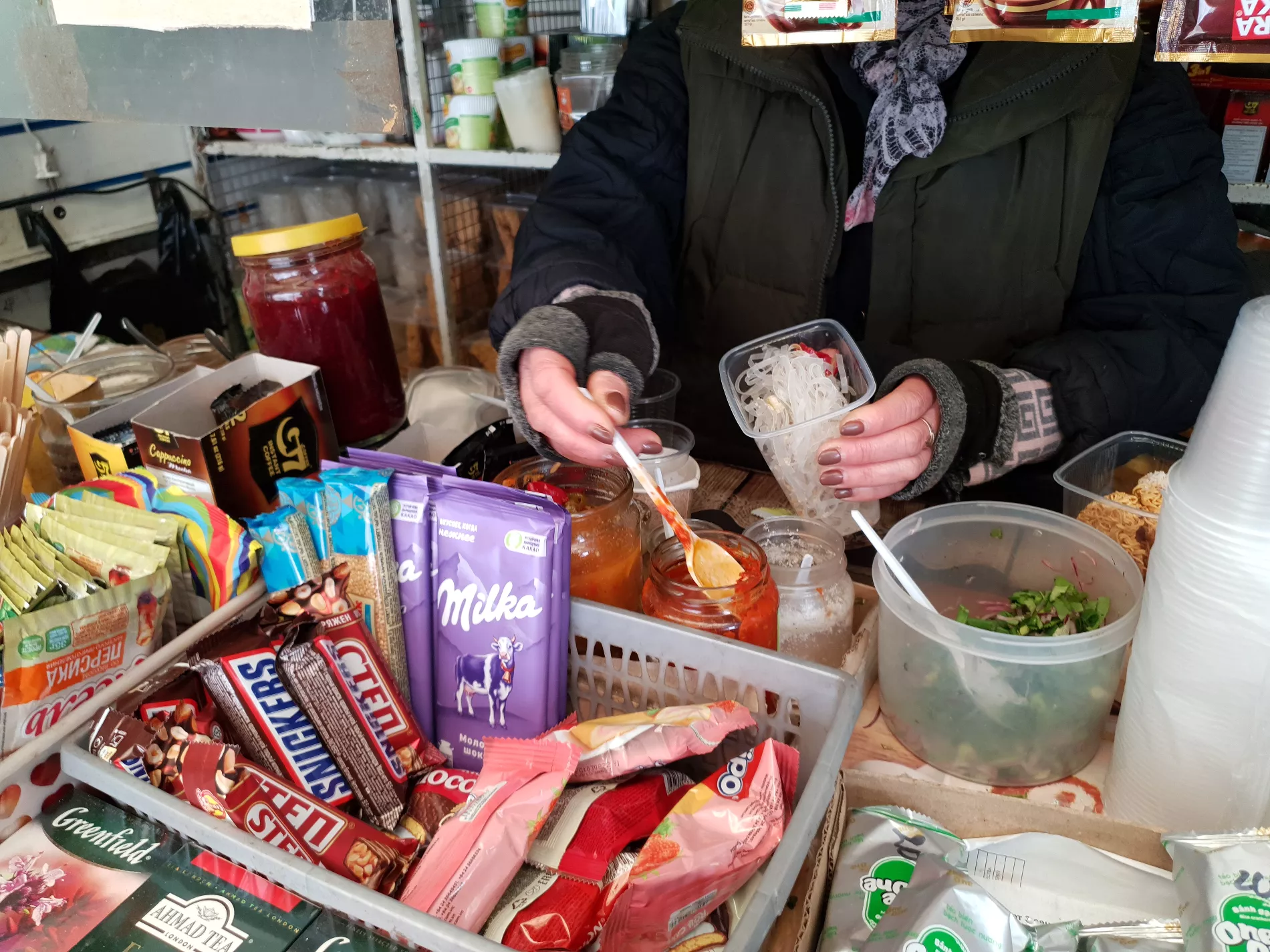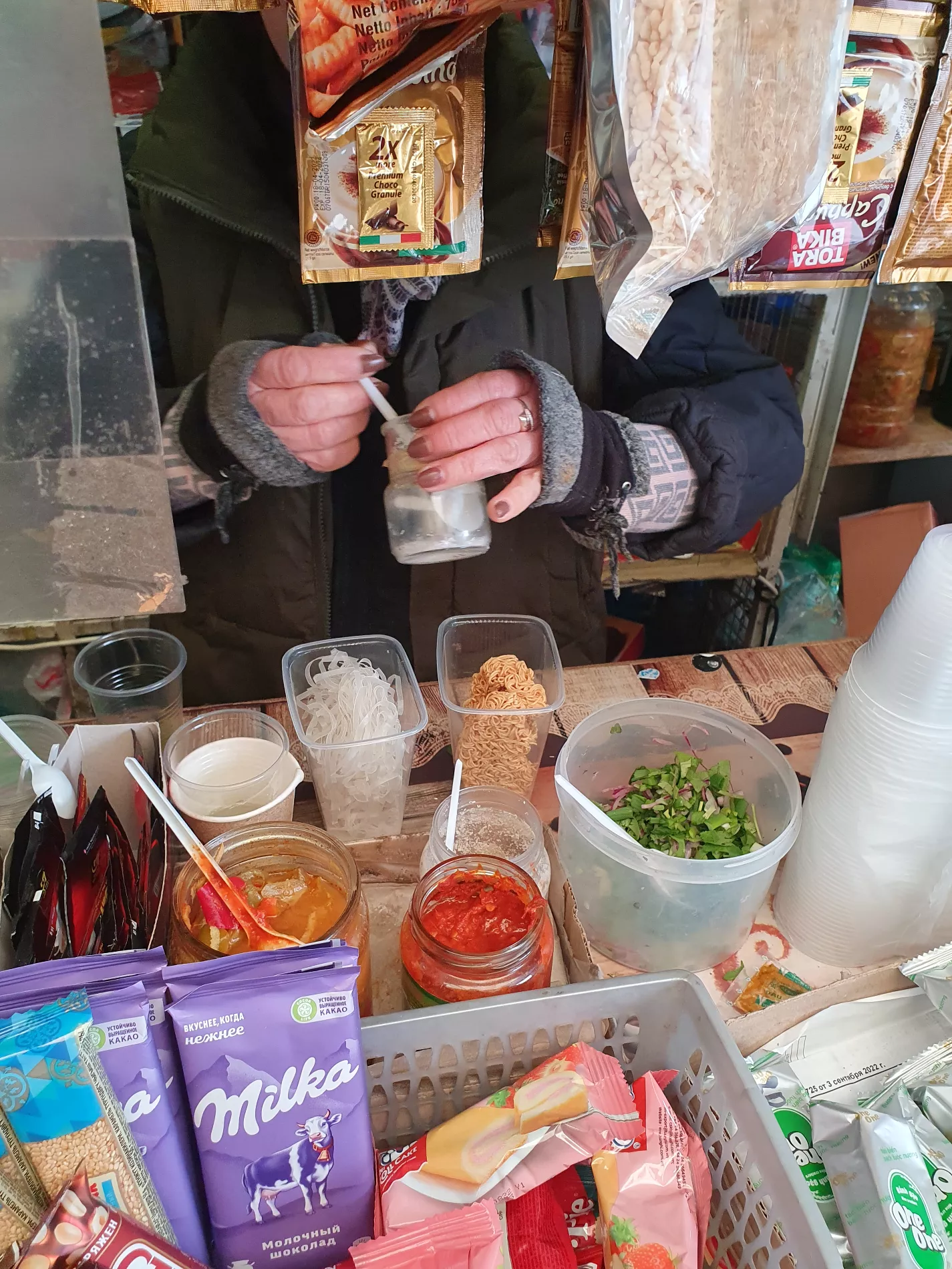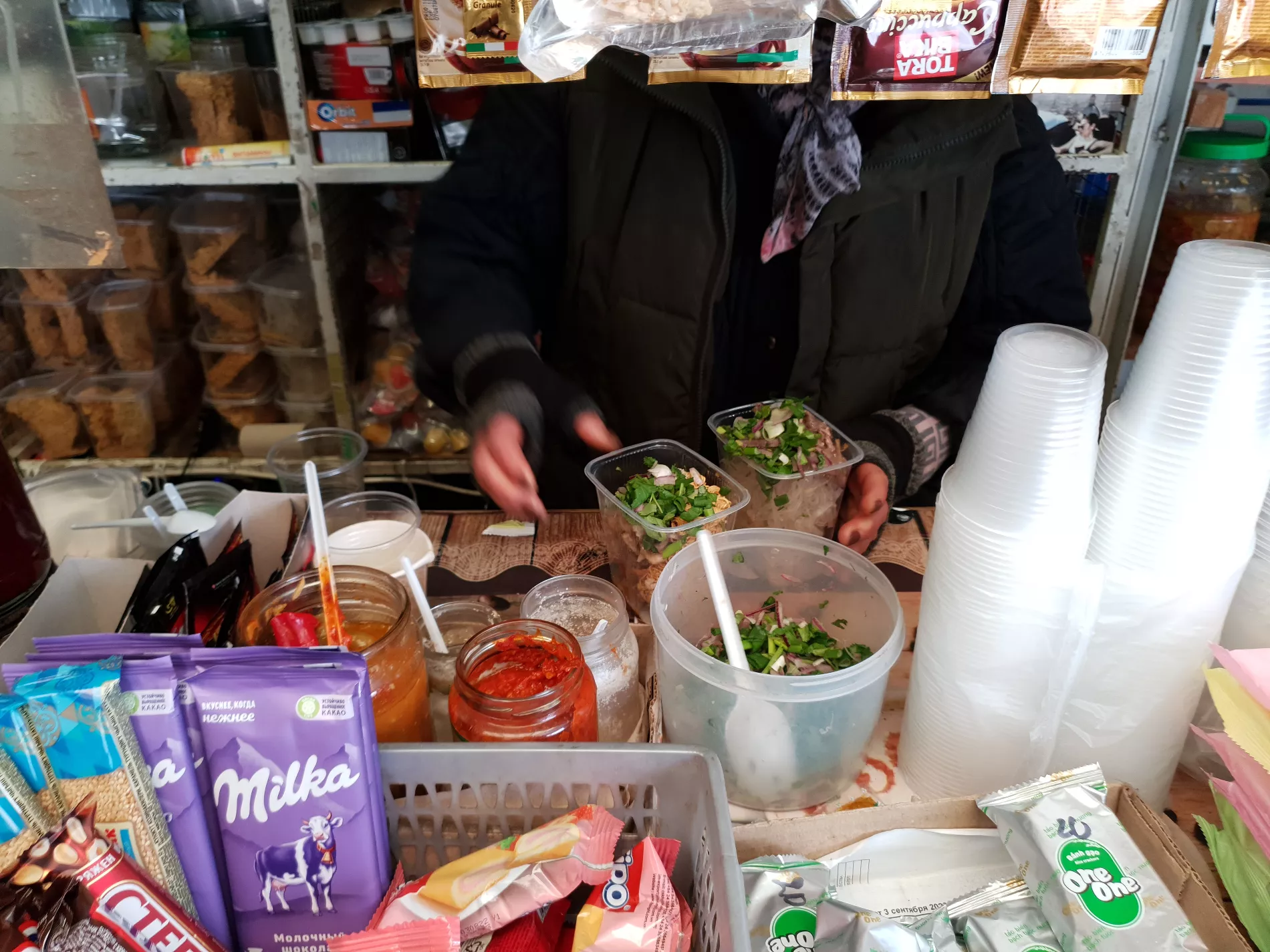 Пока мы ели, у палатки собралась очередь из трех человек. Все они брали по 2-3 супа с собой и удалялись вглубь рынка. Дольше трех-пяти минут лапшичная не пустовала.