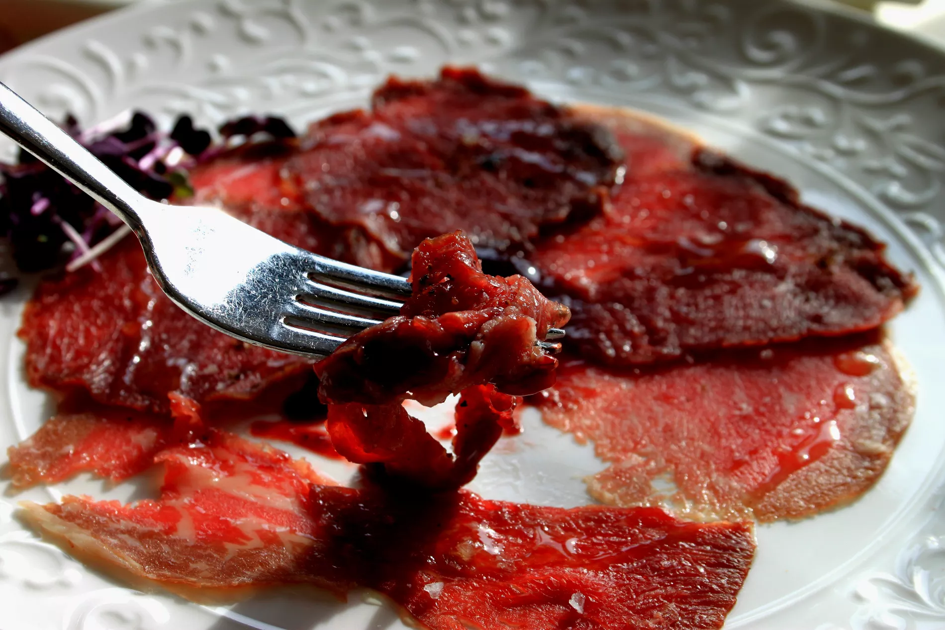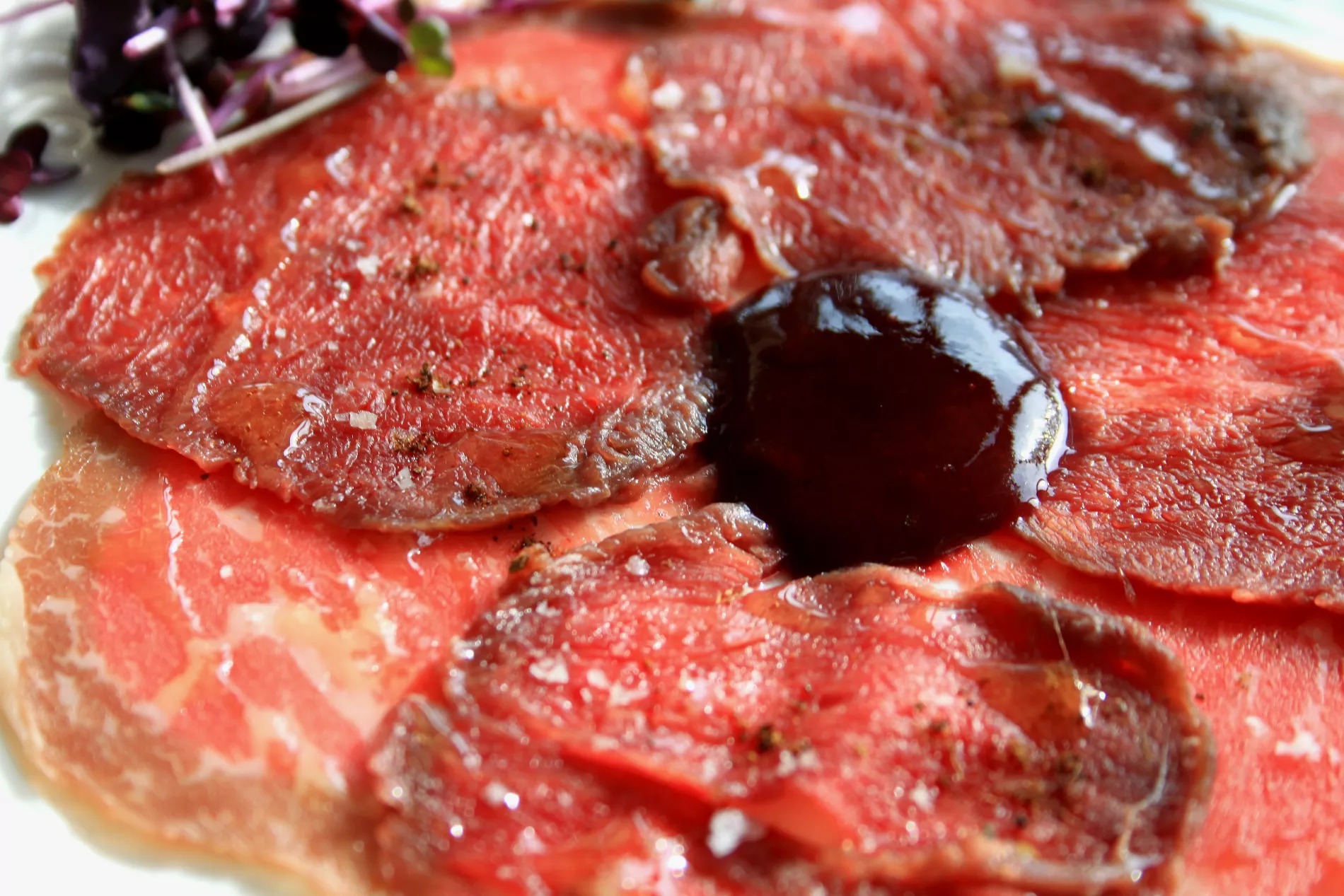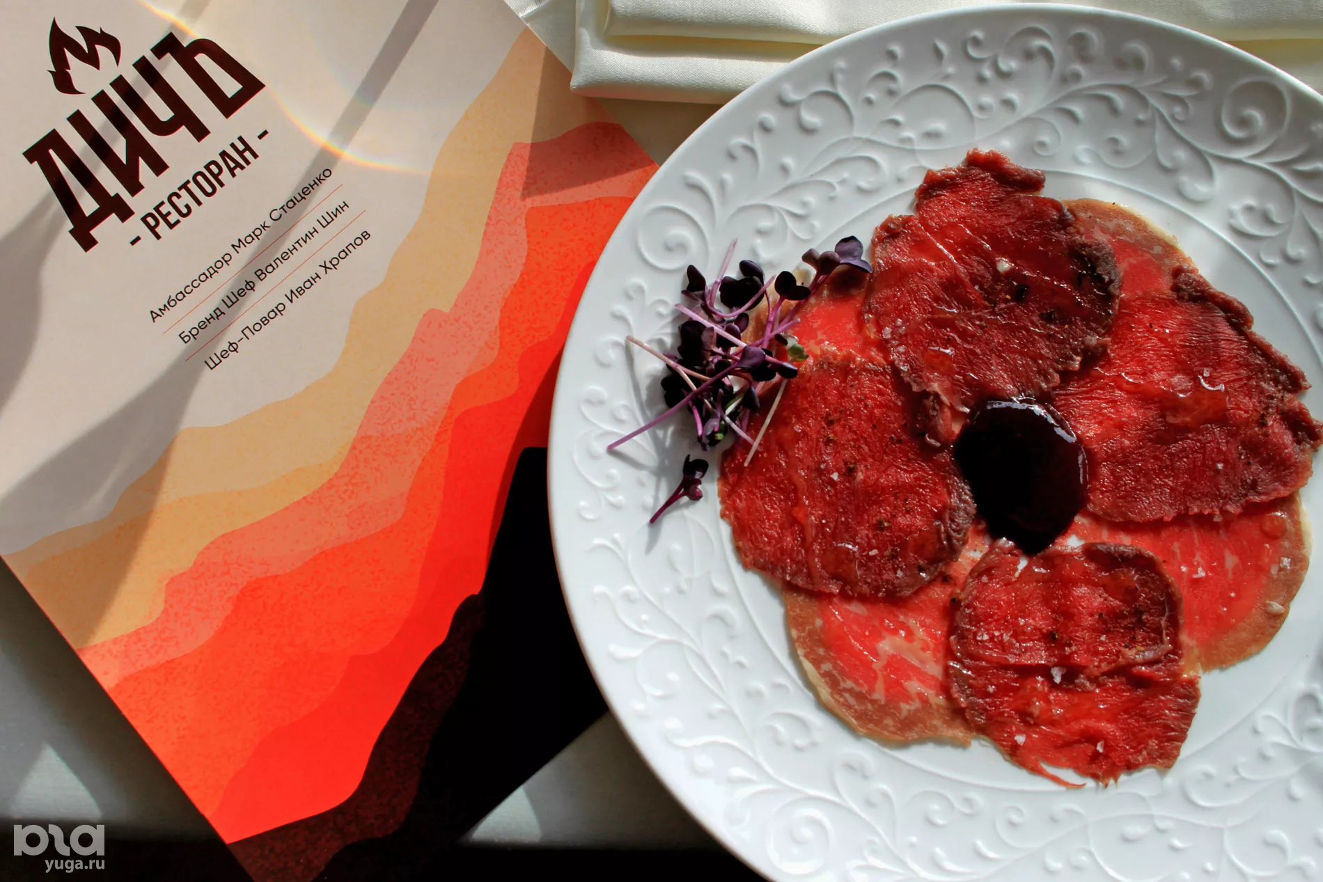 Двойное карпаччо из лося и говядины с самодельным уксусом из малины © Фото Марины Солошко, Юга.ру -