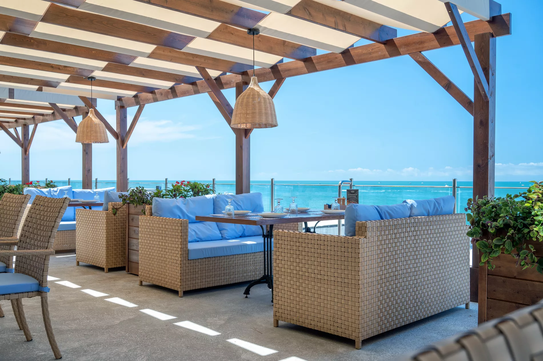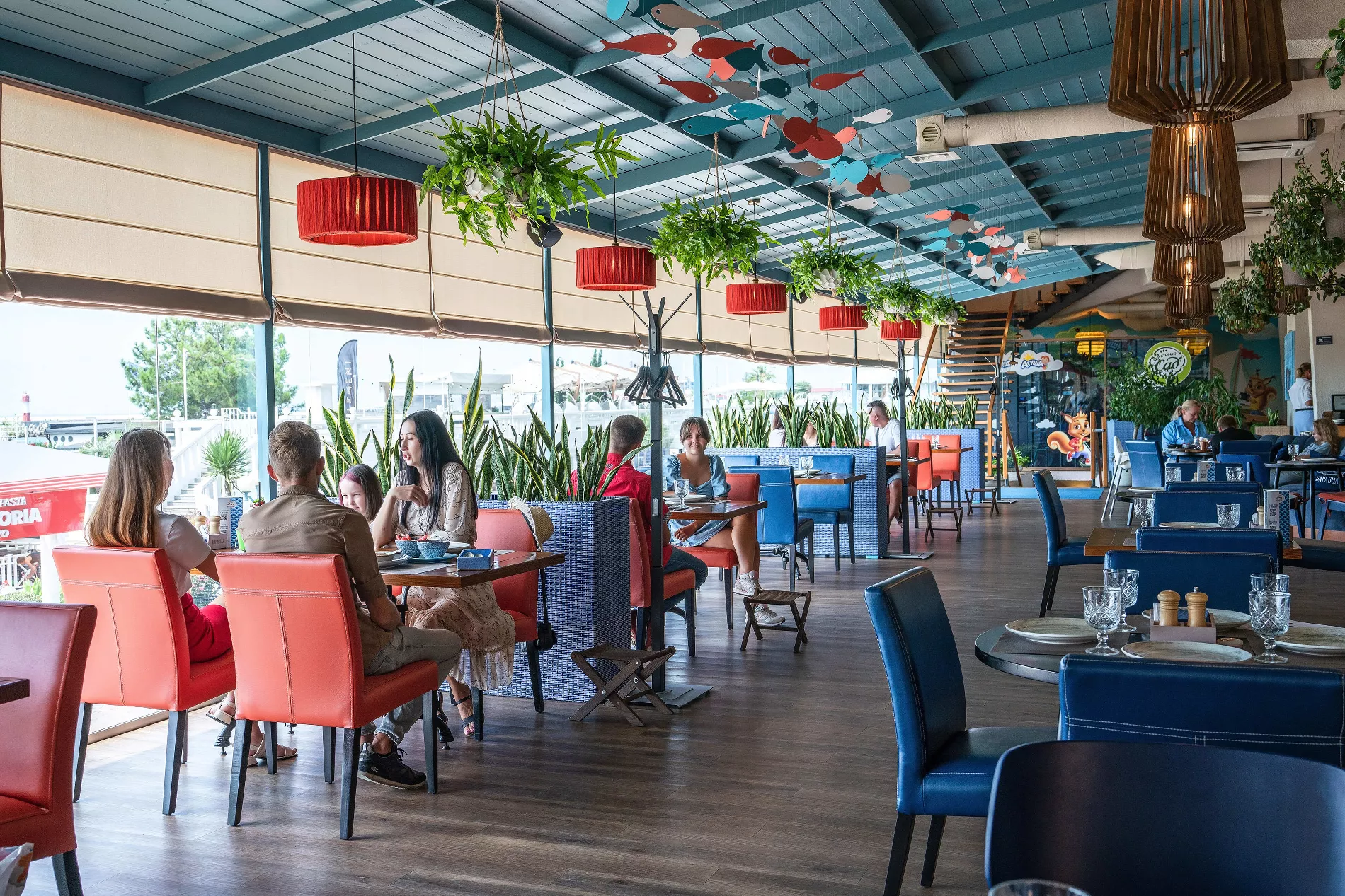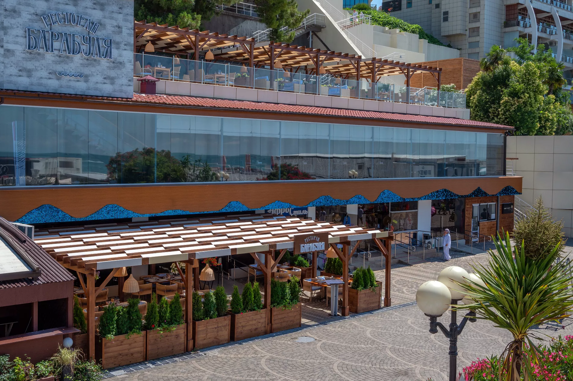 В «Барабуле» две террасы: на набережной — крытая, с видом на море и на третьем этаже ресторана — под столетними соснами и с панорамой морского порта. Для маленьких гостей оборудовали детскую комнату с аниматором.