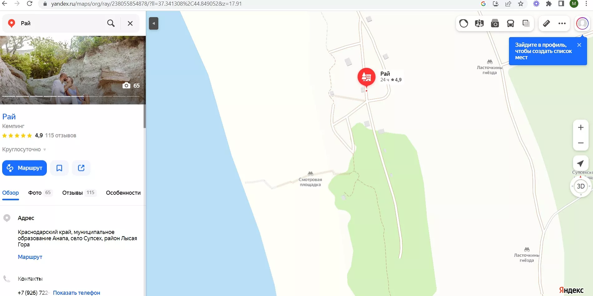 Далее «Яндекс.Карты» проведут по пешеходному маршруту через дачный поселок к кемпингу. Дорога займет около 30 минут, по пути будут таблички с текстом «море прямо», они помогут не сбиться с пути.