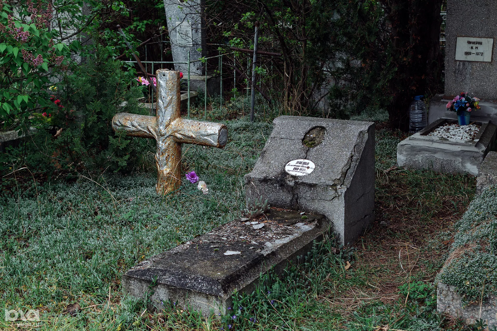 Многие надгробия теряются в зарослях, некоторые уже ушли под землю, эпитафии стерлись, фотографии отвалились. Оставшиеся надписи — на русском, армянском и греческом.