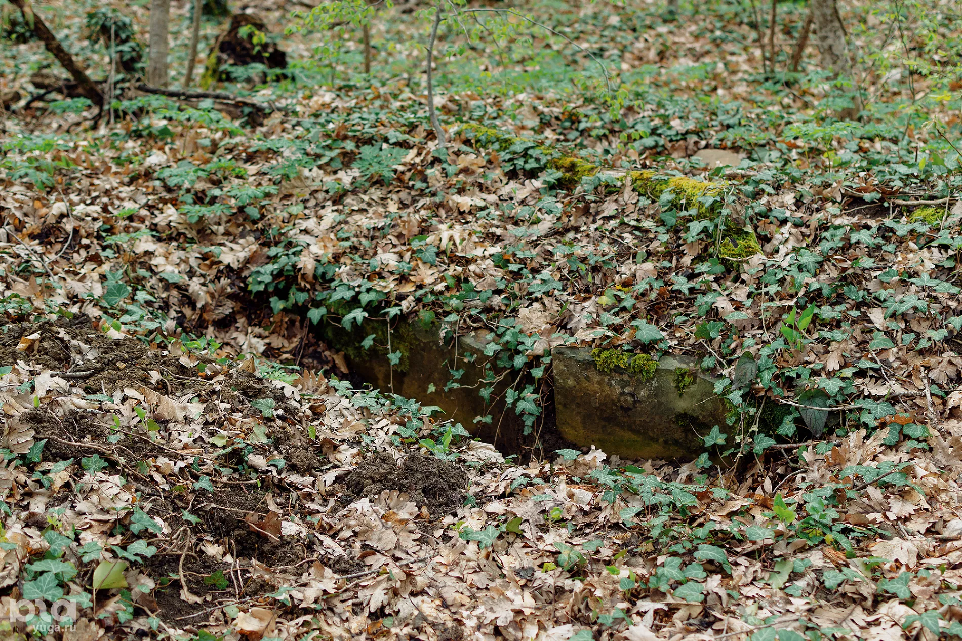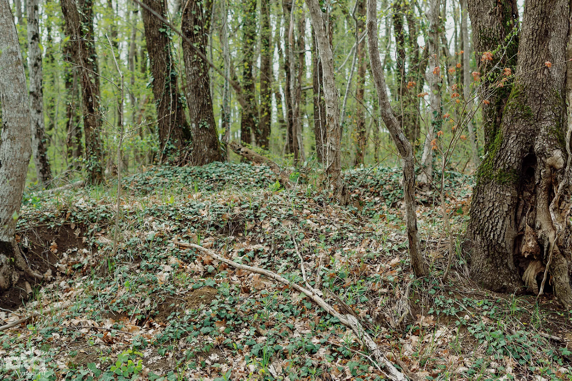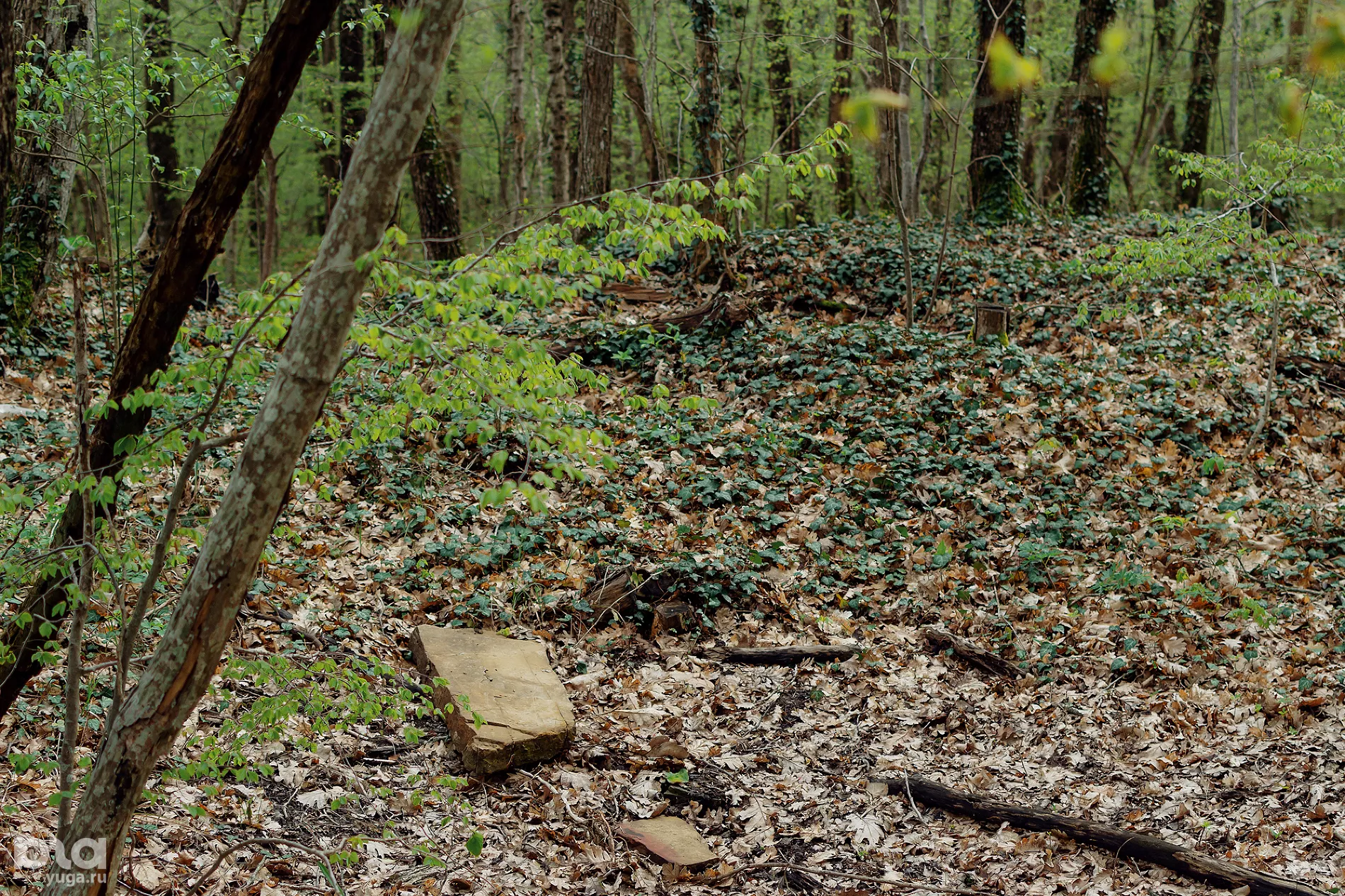 Кладбища в привычном смысле здесь не найти — только тишина и запустение. Вместо могил — цепь холмов высотой до полутора метров, поросшая деревьями, подлеском и плющом. Распознать курганы сложно — о захоронениях говорят лишь торчащие в разных местах отшлифованные камни да углубления на вершинах холмов.