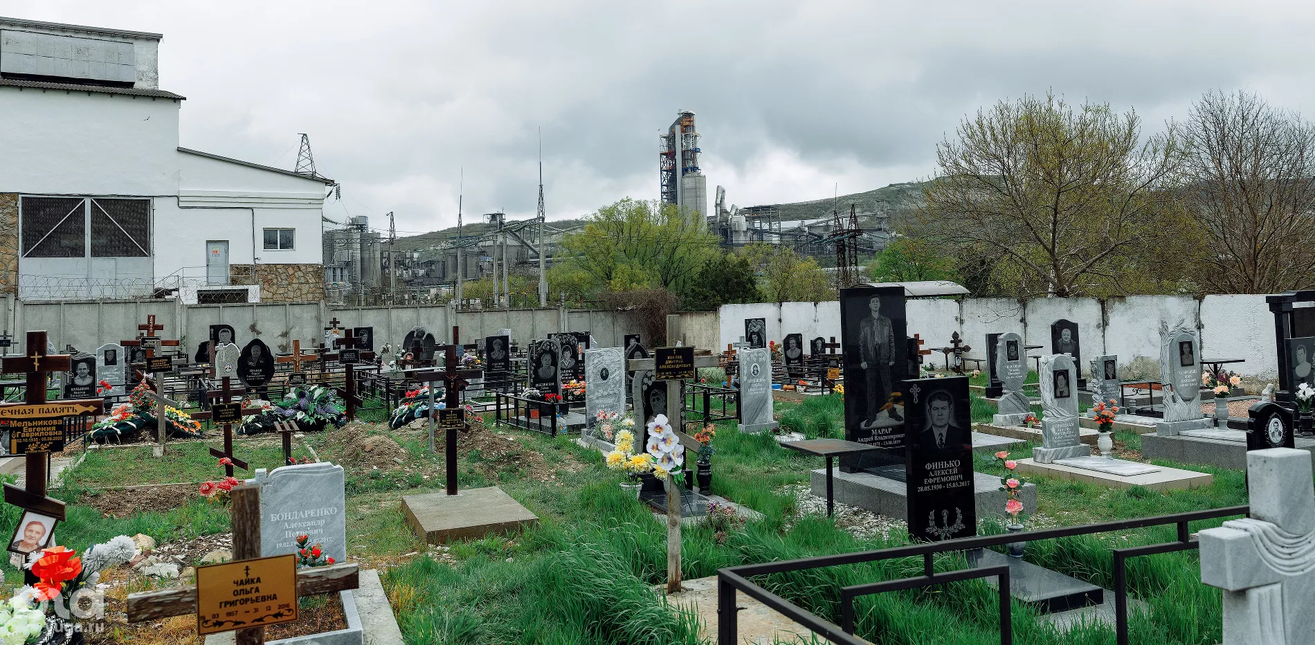 Цементных завода в Верхнебаканском два — севернее и восточнее кладбища. Поэтому фон из заводских труб и резервуаров обеспечен в 50% видов, а на обуви останется серая известняковая пыль с карьеров, разрабатываемых открытым способом.
