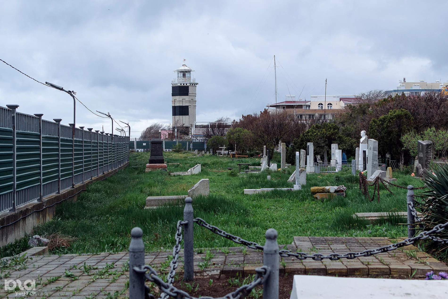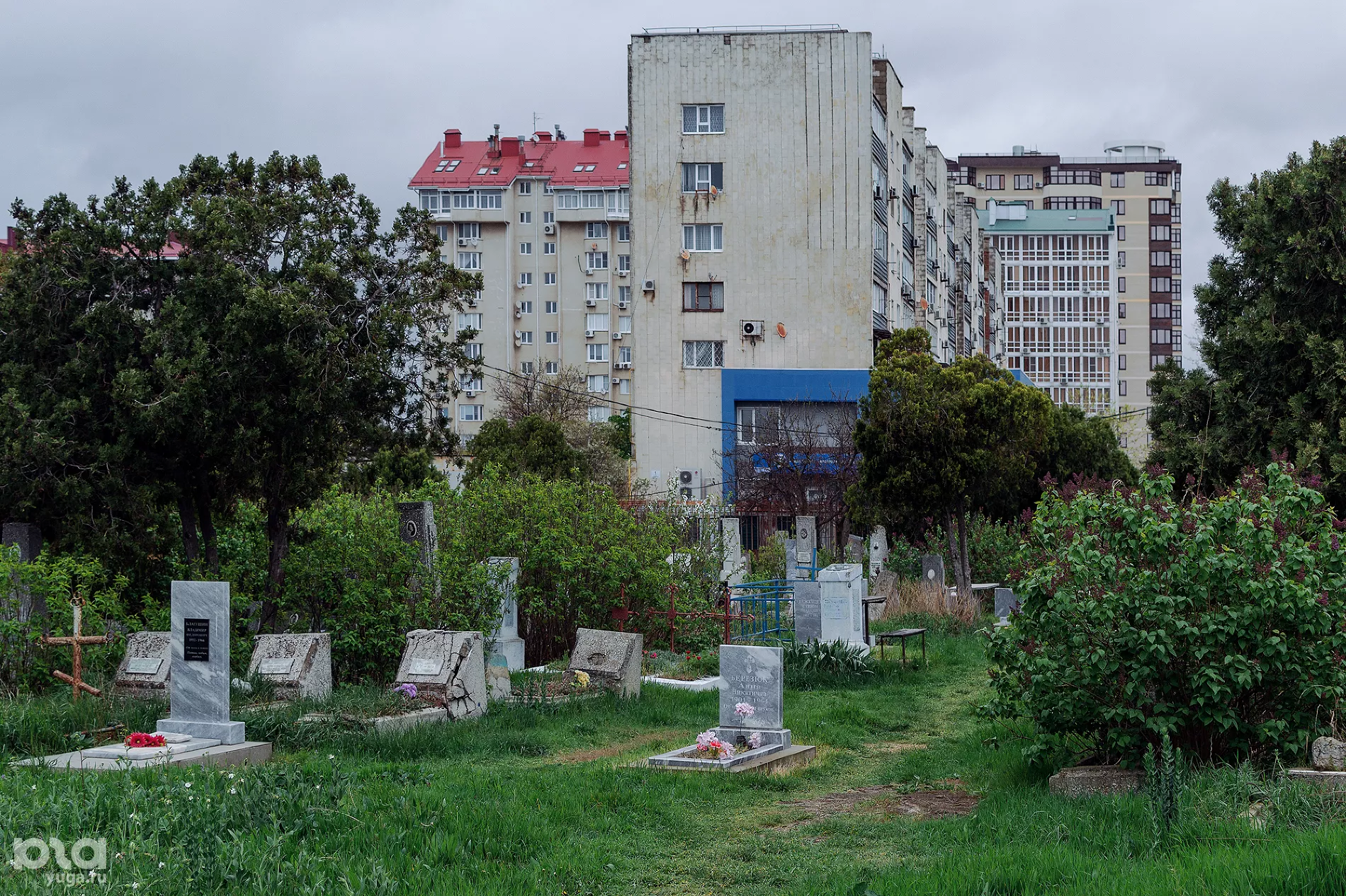 Кладбище находится на обрыве у моря, но его только слышно из-за глухого забора. Со стороны города кладбище окружают многоэтажки — позднесоветские, недавние и заброшенные недостроенными.