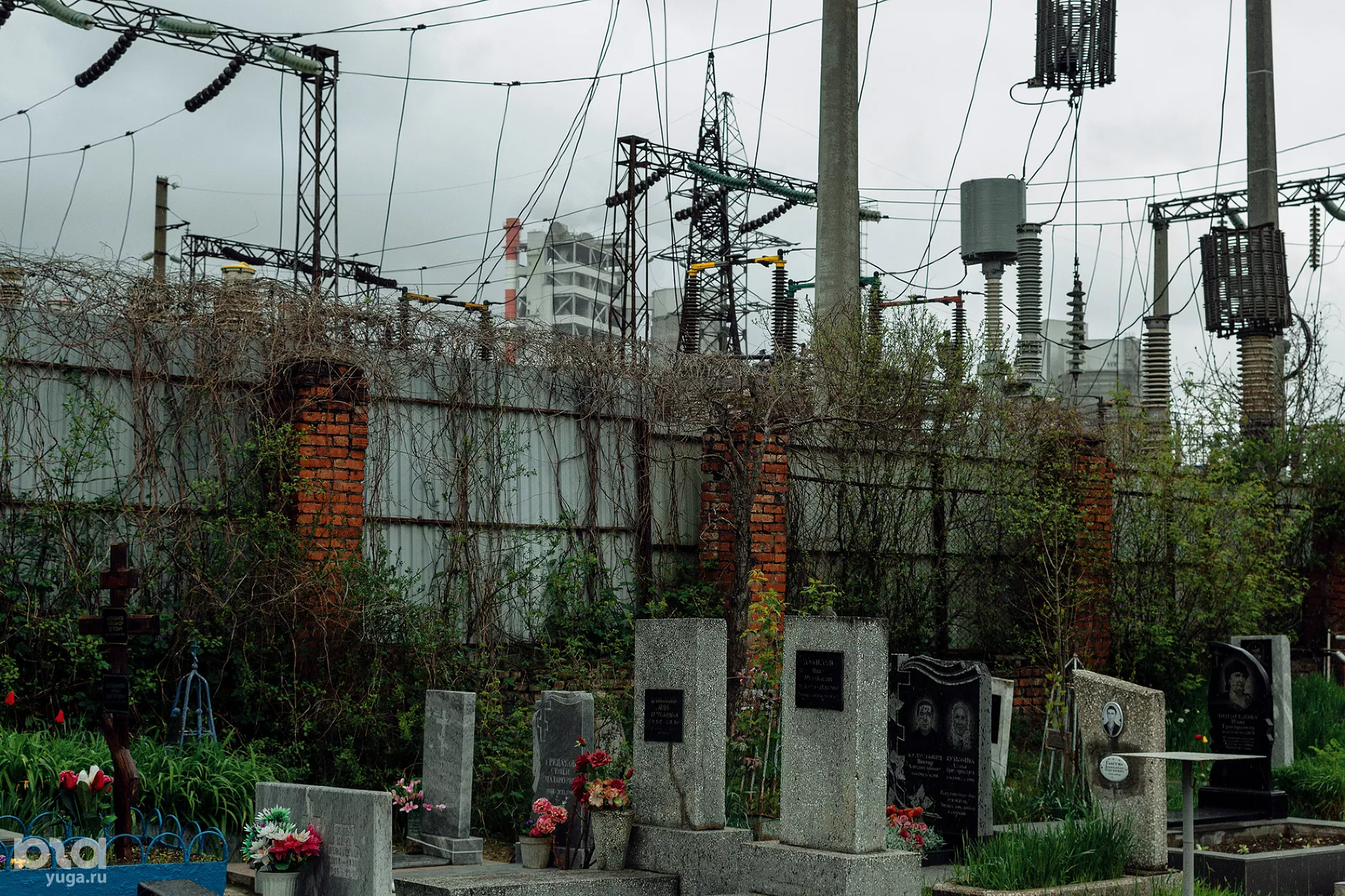С севера кладбище граничит с электростанцией, и несколько опор ЛЭП стоят прямо между могил. В 40 метрах — железная дорога, один из ее путей ведет от цементного завода, и движение составов здесь почти не останавливается.