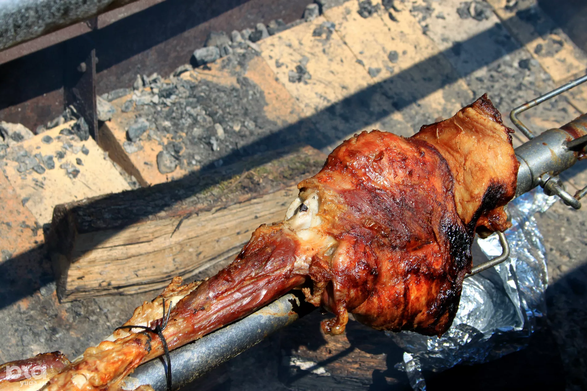 Гостей собирается все больше, и повар «Берлоги» Александр объясняет: «Это фермерский молодой барашек отсюда, с местных гор. Чтобы приготовить такую ногу, нужно 3-4 часа, а до этого она мариновалась где-то 20 часов в простом, но секретном маринаде. Теперь ее нужно долго-долго томить на медленных углях — у меня березовые, они долго прогорают. Подаем мясо с овощами, домашними лепешками, приходите пробовать».