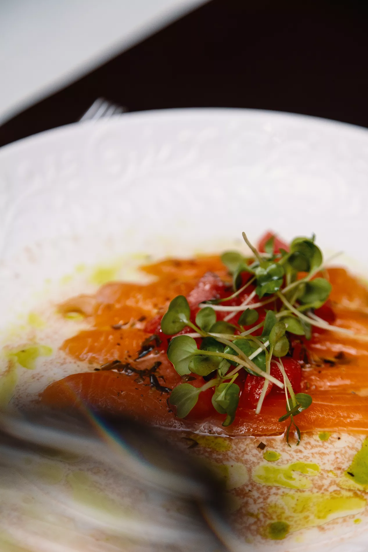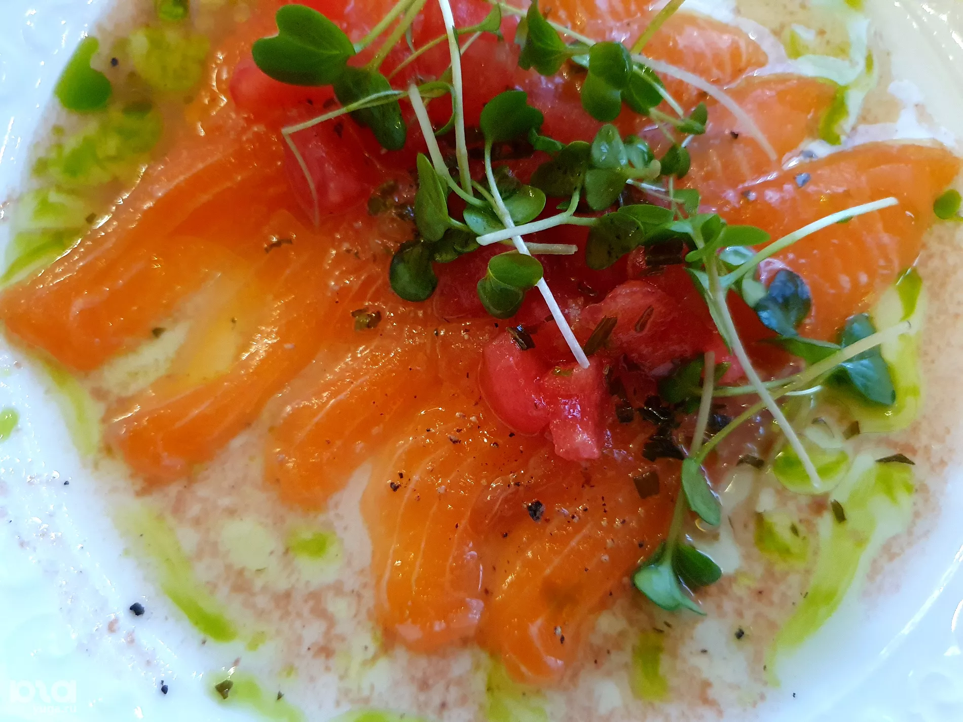Союз нежирной слабосоленой форели и сладковатой ягоды оказался очень приятным. Для баланса в блюдо добавили цитрусовый соус, который разбавил сладко-соленый вкус. Фишка этой закуски, несмотря на смелую идею, — простота. Такой эксперимент можно повторить даже дома, ведь количество ингредиентов здесь минимальное.