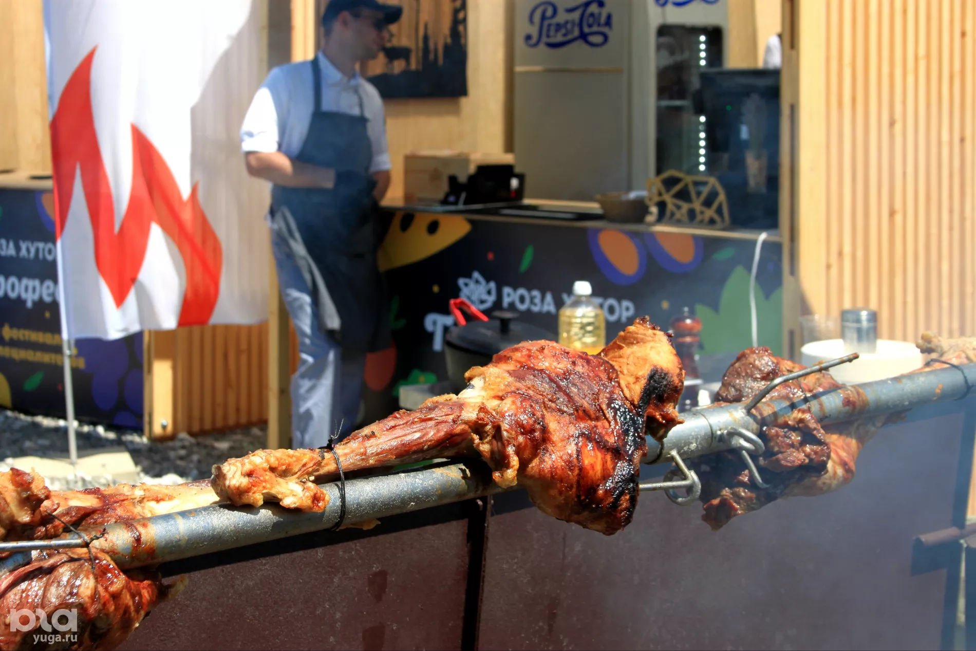 В Сочи +37°С. Первая остановка канатной дороги — Горная Олимпийская деревня. На выходе из кабинки аромат мяса на гриле такой многообещающий, что маршрут строится сам собой. На большом вертеле возле кафе «Берлога» медленно, почти гипнотически, вращается уже подрумяненное мясо.