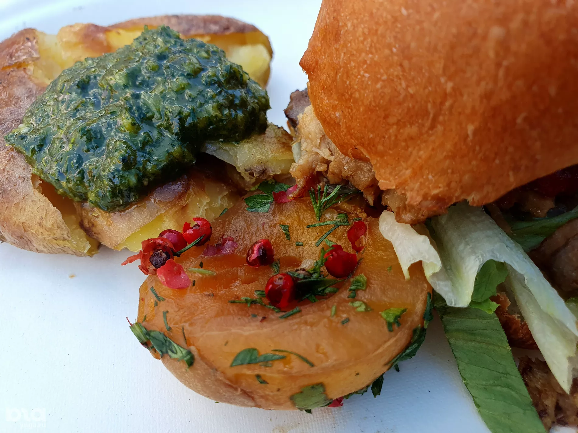 Первым пробую блюдо с ягненком — это что-то вроде бургера, но очень нежного: мясо тает во рту, булочку подрумянили, но она все равно пышная и мягкая. Соус с инжиром добавляет одновременно и сладости, и кислоты. Салат легкий и хорошо подходит к мясу. Две трети сета очень сытные, но я все равно добираюсь до десерта.