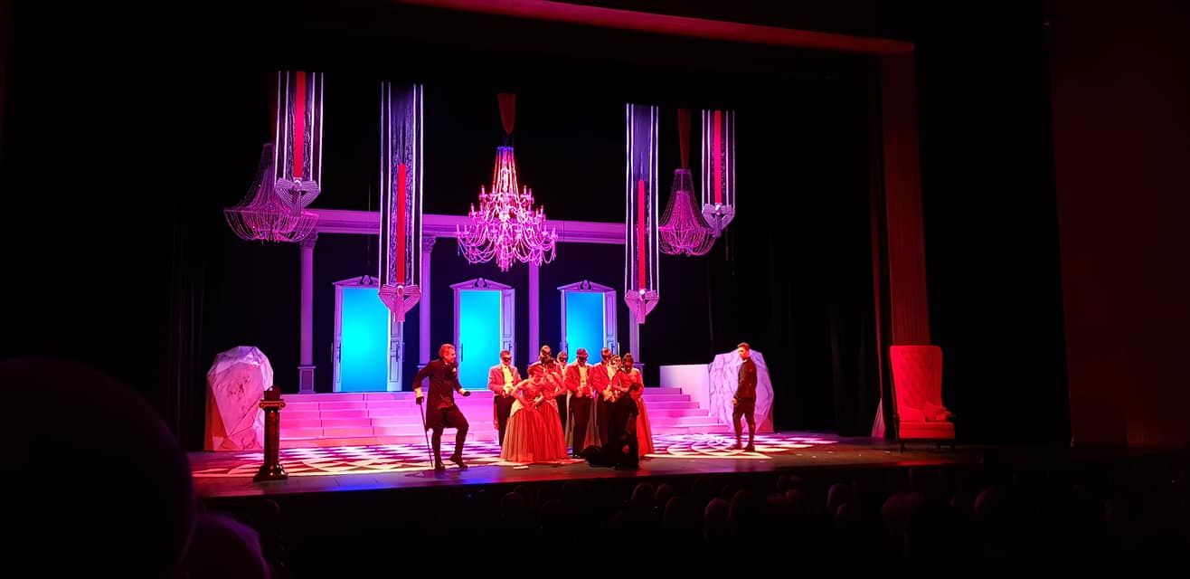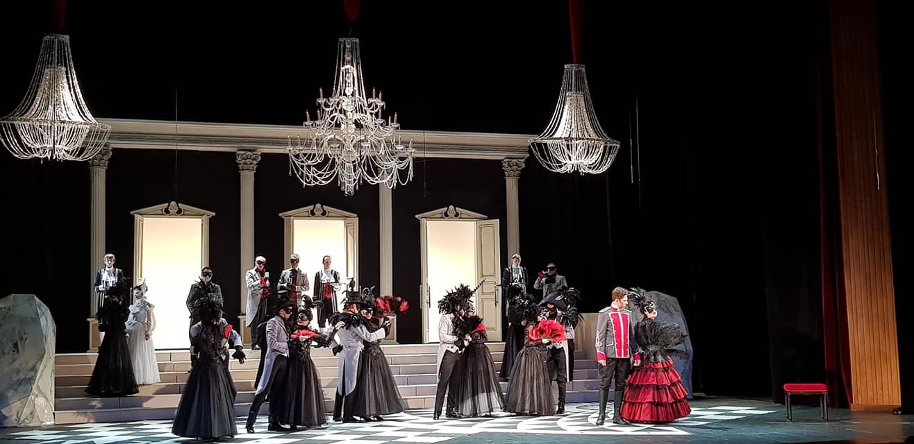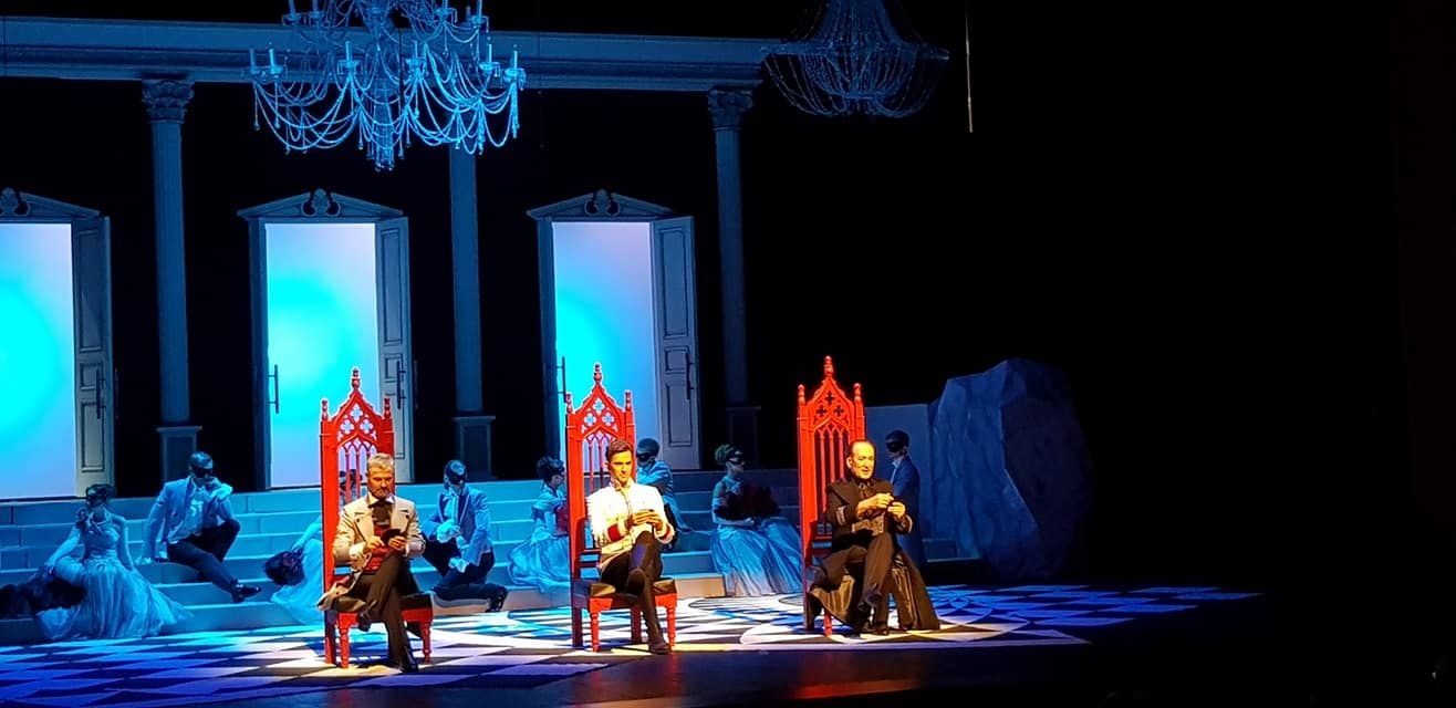 Решение Андрея Климова (сценография и костюмы) ограничиться тремя цветами — белым, черным и красным — решает массу задач. Они вне времени и моды (привет модельеру Вячеславу Зайцеву), плюс — при минимуме вложений позволяют выглядеть богато и нажимать нужные клавиши символов. Художник так же придумал парадную лестницу с тремя дверьми — порталами в … (куда захотите). Лаконично и многозначительно. А готические кресла (совсем «из другой оперы»), видимо, должны включить наше мистическое воображение. И да, три красных стула на авансцене позволяют игрокам эффектно понтировать, несоразмерные карты даже улетают в зал (хочется пошутить про антагонистов — двух джокеров (темного и белого), но вряд ли режиссер так далеко фантазировал. Про расклад главных персонажей как карт в колоде тоже не буду, хотя возможно и такое прочтение: Арбенин — король, Звездич — валет, Нина — дама, Неизвестный — туз и т.д.)