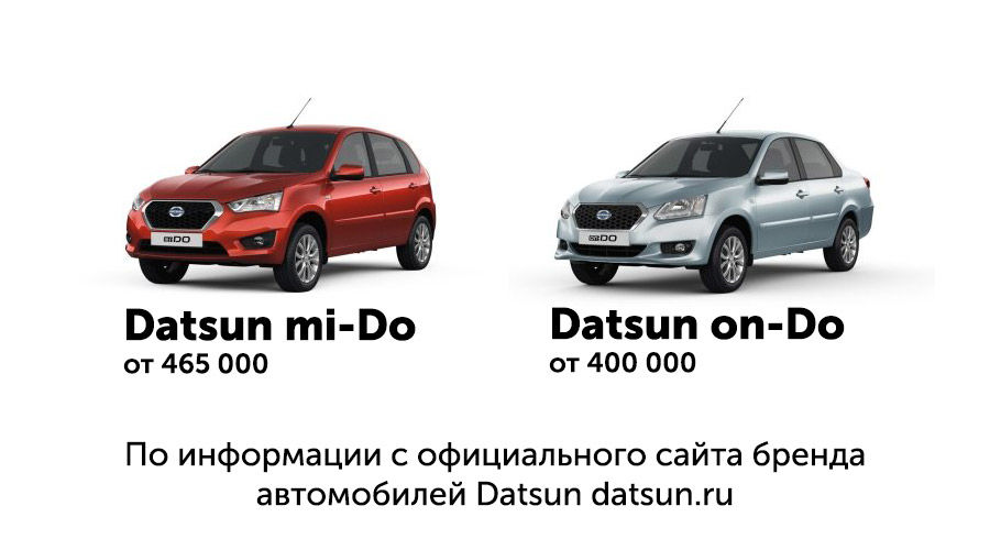 Datsun on-DO и Datsun mi-DO. Иномаркой этот автомобиль уже мало кто считает, причем зря. Также есть мнение, что эти машины делают на одном конвейере с уже канувшей в лету Lada Kalina. Это не совсем так. Когда их запускали в производство, нас любезно позвали осмотреть логово «Датсуна» на Волжский автозавод. Одна платформа с «Калиной/Грантой» еще ничего не говорит. У «Логана» и «Дастера», например, тоже одинаковые платформы, но машины совершенно разные. Если сравнивать с «Жигулями», то Datsun может похвастать лучшей шумоизоляцией, иными газонаполненными амортизаторами, пружинами другой жесткости, тормозной системой. Естественно, отличается дизайн экстерьера и интерьера. Все необходимое на борту имеется: электроусилитель руля, ABS (антиблокировочная система торможения), BAS (усилитель экстренного торможения), EBD (система электронного распределения тормозных усилий).
