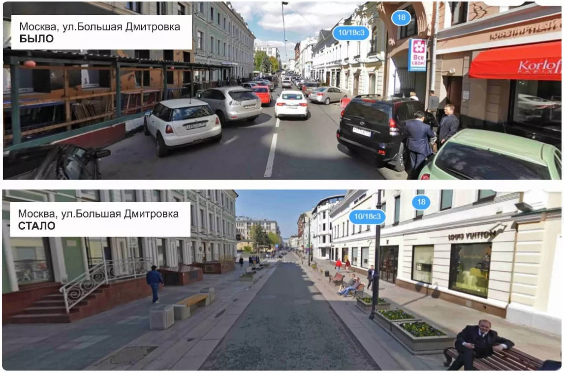 Яркий пример такого подхода к решению задачи — это реконструкция улицы Большая Дмитровка в Москве. Условия чем-то схожие с нашей ул. Красноармейской. Была загруженная трафиком улица с запаркованными по обочинам автомобилями и с практически отсутствующим тротуаром. После реконструкции, сужения дороги до одной полосы, трафик резко снизился (что можно наблюдать в том числе по «Яндекс.Панораме»). А пешеходный — вырос, и это несмотря на присутствие параллельной доминирующей улицы Тверской (у нас так же располагается Красная относительно Красноармейской).
