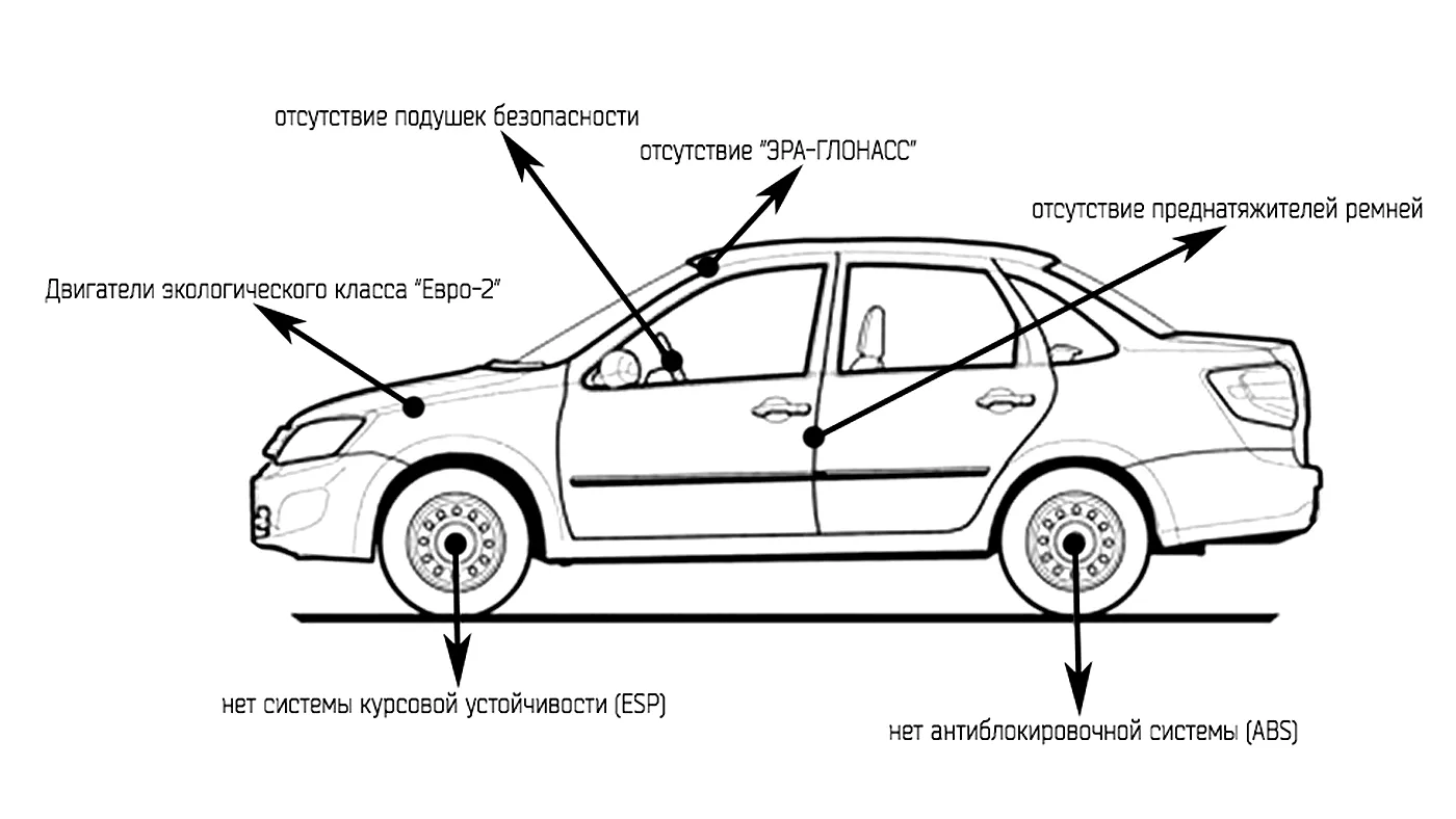 Автомобиль также лишился кондиционера (был опцией), системы курсовой устойчивости, преднатяжителей ремней безопасности и «ЭРЫ-ГЛОНАСС».