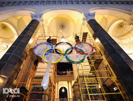 Гигантские олимпийские кольца разместили на железнодорожном вокзале в Адлере и на площади у городской администрации Сочи за 50 дней до старта Олимпиады.