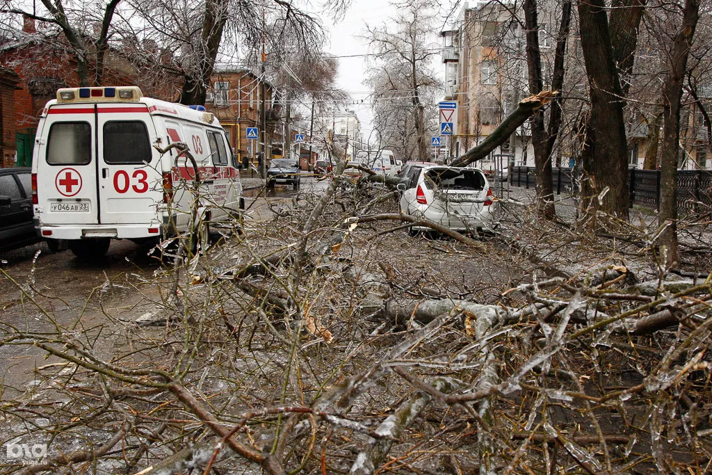 В городские службы Краснодара поступили сообщения о 310 упавших деревьях и более 1500 упавших веток. По словам очевидцев, в районе Восточного трамвайного депо на улице Ставропольской, обледеневшее дерево упало на девушку, которая от полученных травм скончалась на месте.