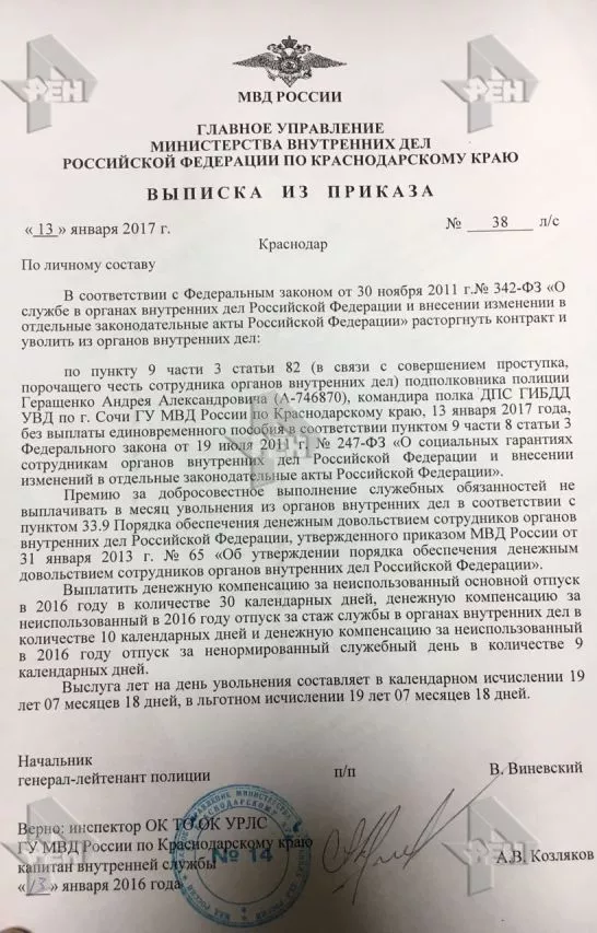 13 января ГУ МВД по Краснодарскому краю опубликовало приказ, в котором говорится об увольнении Геращенко. Выслуга лет на день увольнения составила 19 лет и 7 месяцев, передает РЕН ТВ.