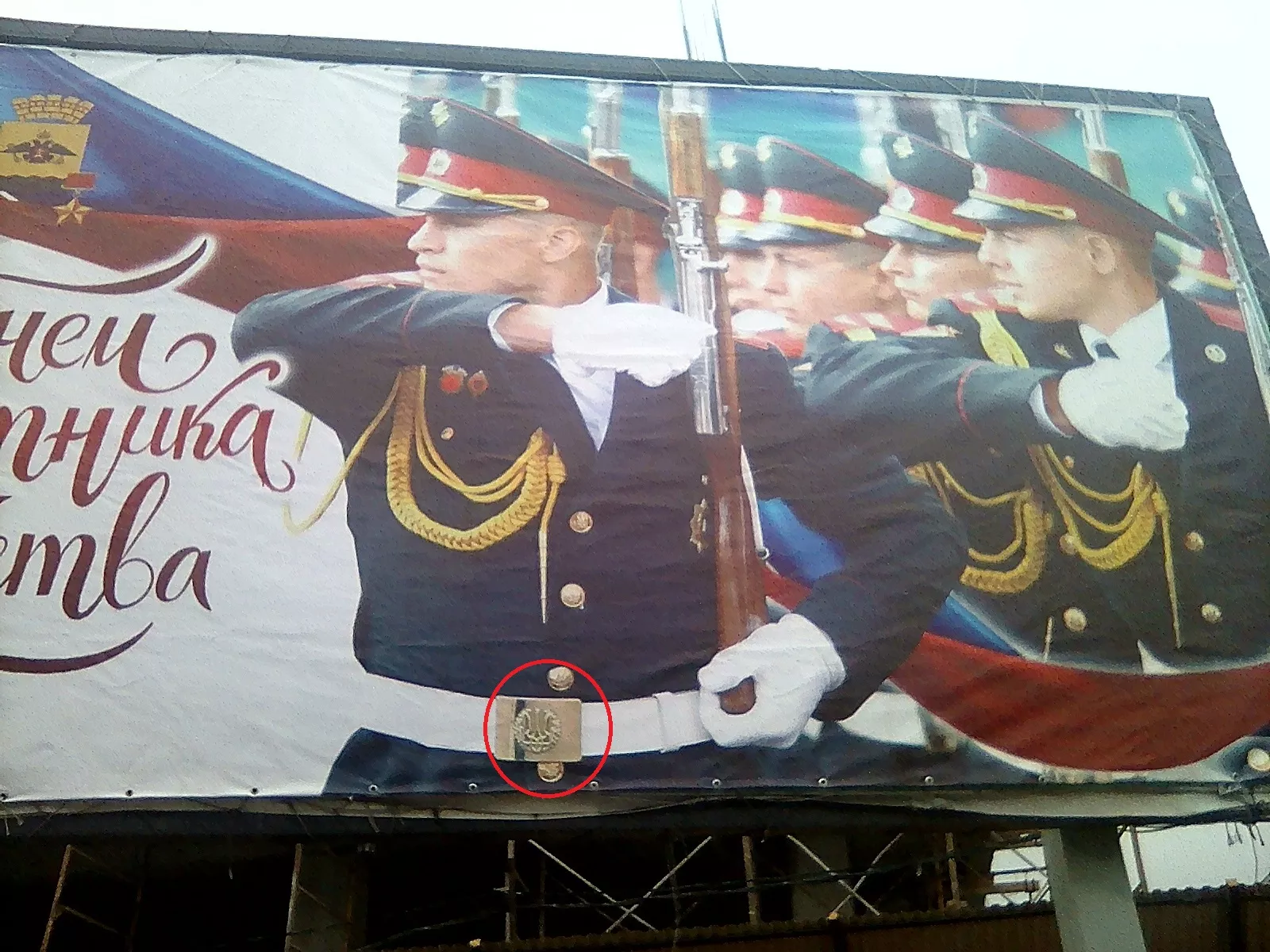 На необычное поздравление обратили внимание жители города-героя. В соцсетях распространились фотографии баннера, на котором военные в украинской форме (на бляхе и пуговицах хорошо виден украинский трезубец) шагают на фоне российского флага.