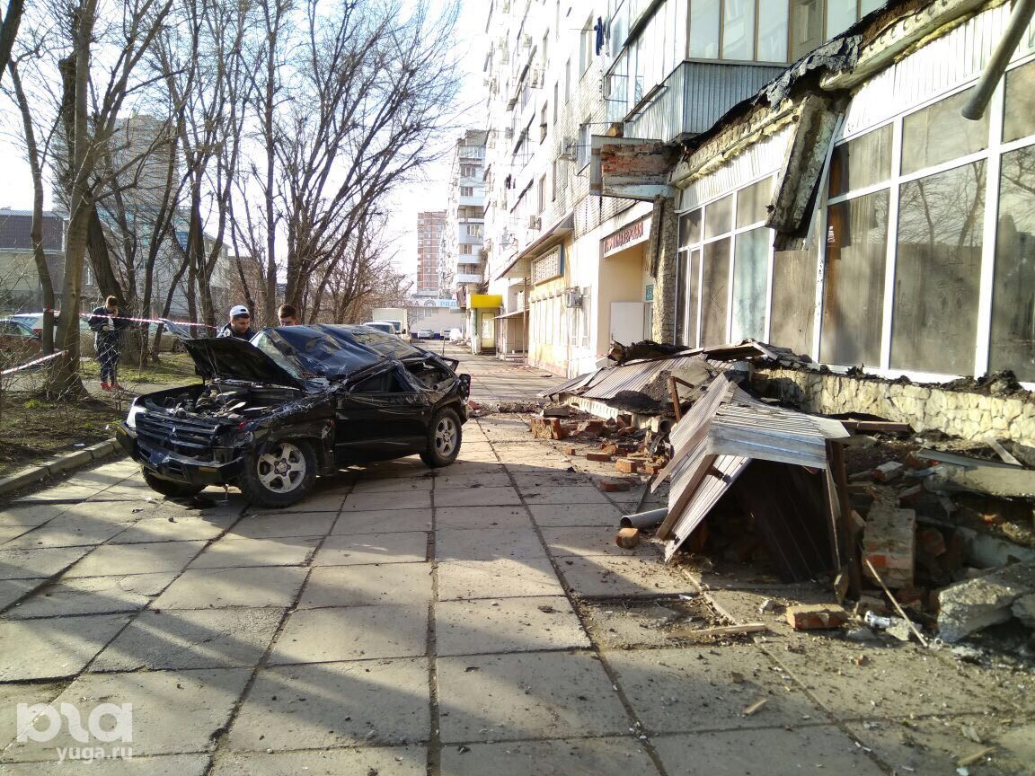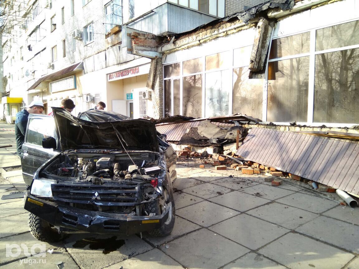 На улице Промышленной, 23 в Краснодаре козырек жилого здания придавил автомобиль Mitsubishi
