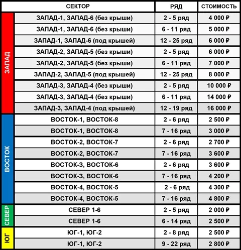 Дешевле всего будет стоить билет на северной трибуне — 2 тыс. рублей. Стоимость самого дорогого места составит 16 тыс. рублей.