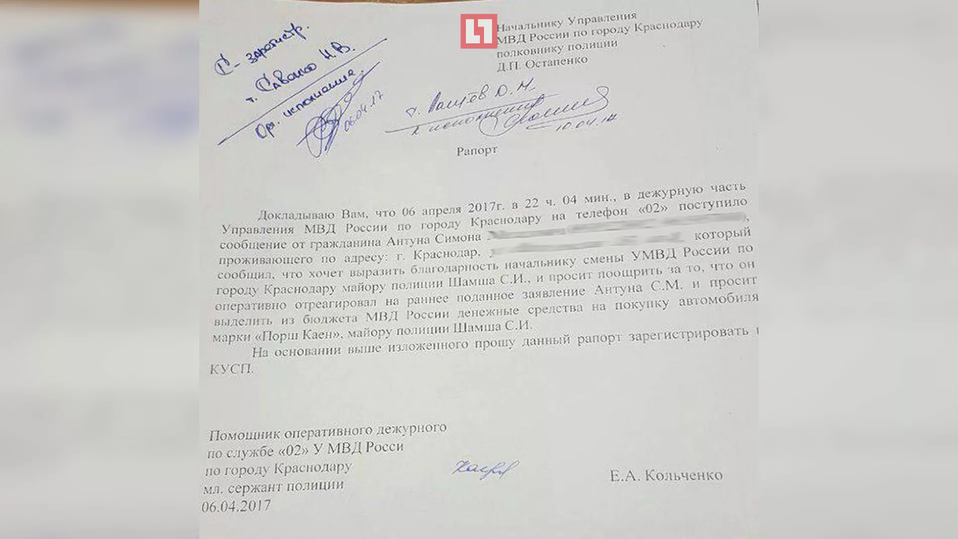 «Поощрить за то, что он оперативно отреагировал на ранее поданное заявление Антуна С.М., — говорится в рапорте на имя начальника УМВД России по Краснодару. — Выделить из бюджета МВД России денежные средства на покупку автомобиля марки "Порш-Кайен" майору полиции Шамша С. И.»