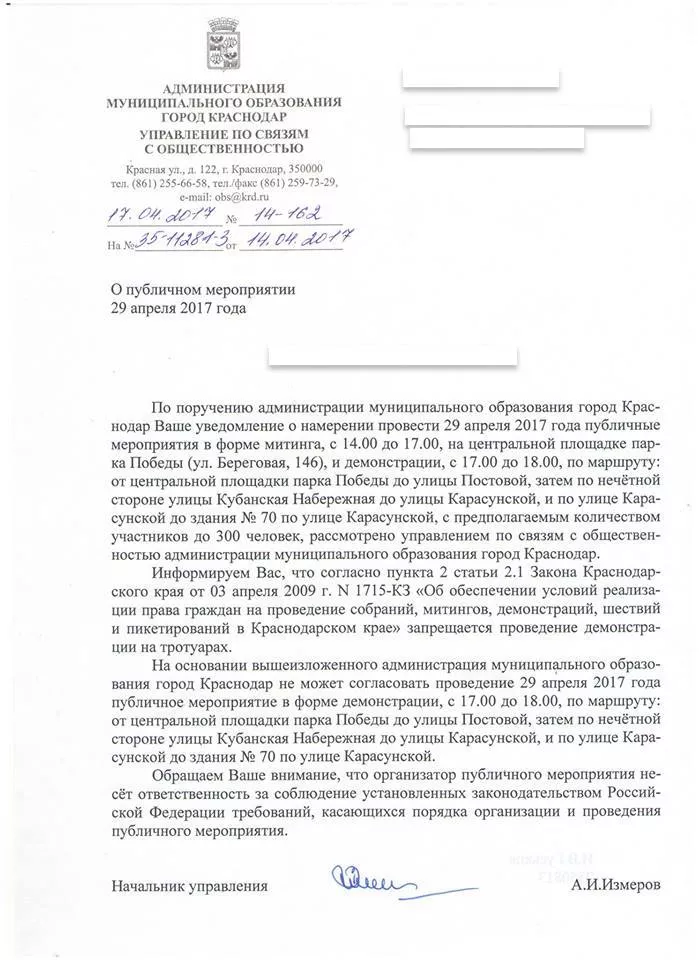 17 апреля был получен ответ, в котором говорится, что законом запрещается проведение демонстрации на тротуарах.