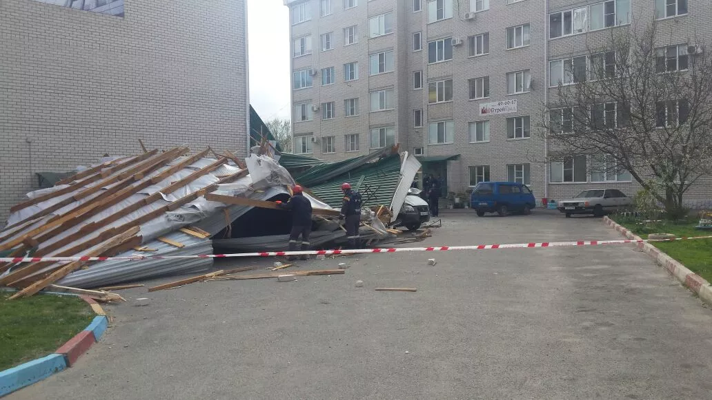 В Ставрополе 22 апреля из-за сильных порывов шквалистого ветра до 25 м/с крыша пятиэтажного дома упала и повредила припаркованные автомобили