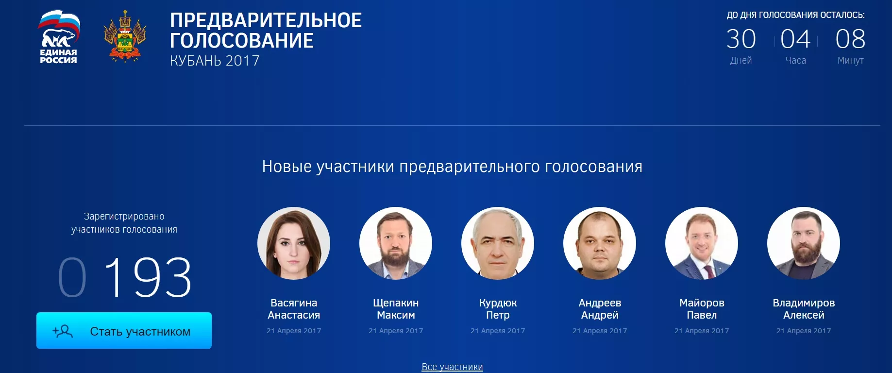 В число зарегистрировавшихся на праймериз вошли вице-губернаторы Сергей Алтухов, курирующий промышленный сектор, и Сергей Усенко, отвечающий за земельные вопросы и курортную сферу, мэр Анапы Сергей Сергеев, глава Динского района Сергей Жиленко и глава Туапсинского района Владимир Лыбанев.
