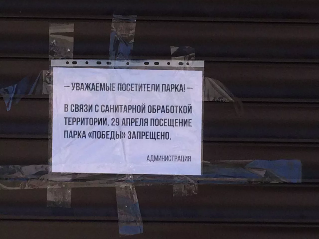 «Уважаемые посетители парка! В связи с санитарной обработкой территории 29 апреля посещение парка Победы запрещено», — говорится в объявлении, размещенном на входе в зеленую зону.
