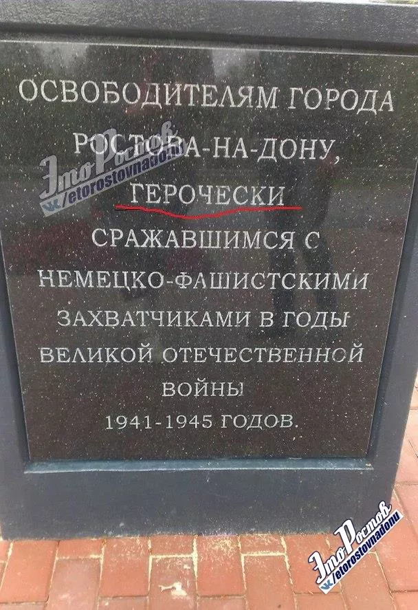 Памятник, посвященный освободителям города Ростова от фашистских захватчиков в годы Великой Отечественной войны, установили накануне 9 мая на Кумженском мемориале. При этом в надписи на памятнике допущена ошибка: в слове «героически» пропущена буква «и».