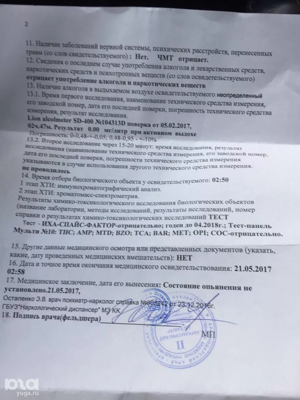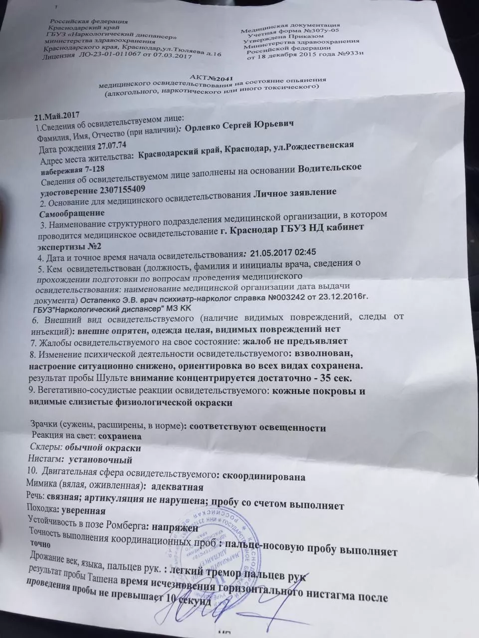 «У меня вызвали сомнения приборы, которыми меня собирались "обследовать". Сотрудники ДПС отказались везти меня на освидетельствование, и я поехал на такси сам. Освидетельствование прошел успешно. Врачи подтвердили мою трезвость», — рассказал Орленко порталу Юга.ру.