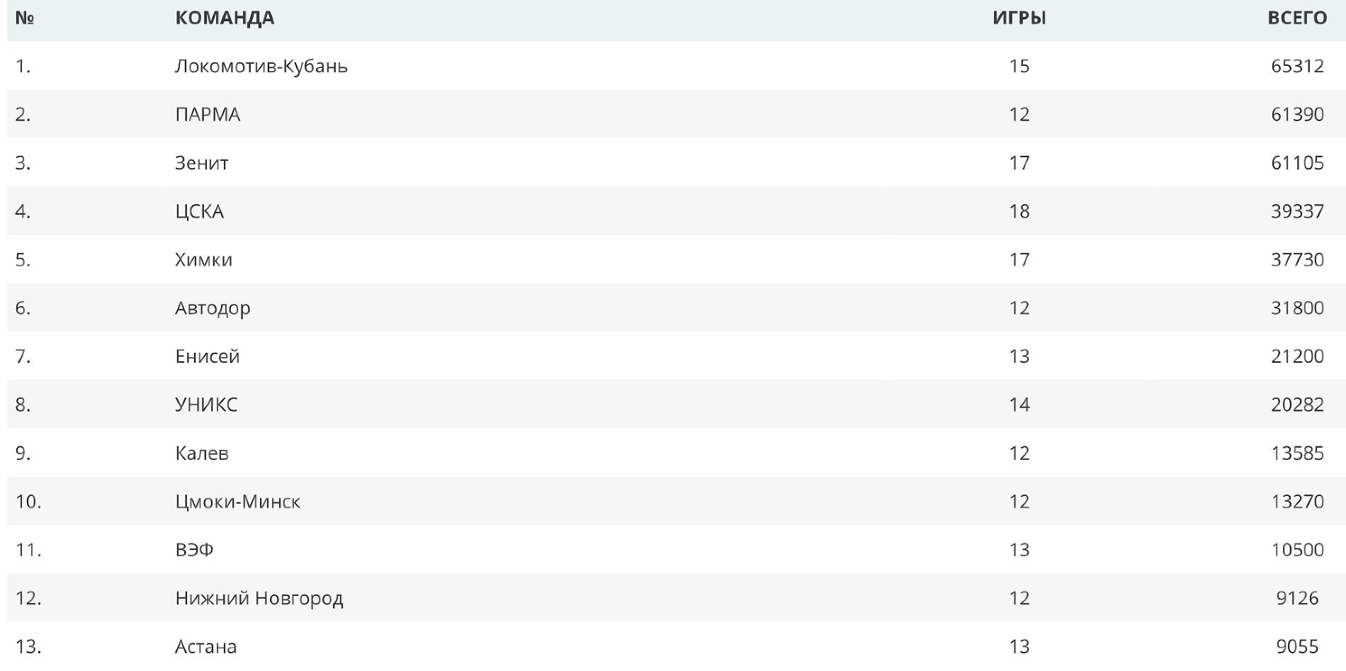 В прошедшем игровом году «Локо» провел 15 матчей, которые посетили 65 тыс. 312 болельщиков. Второй стала пермская «Парма», за 12 игр собравшая 61 тыс. 390 человек. Третье место занял питерский «Зенит» — 61 тыс. 105 зрителей в 17 матчах.