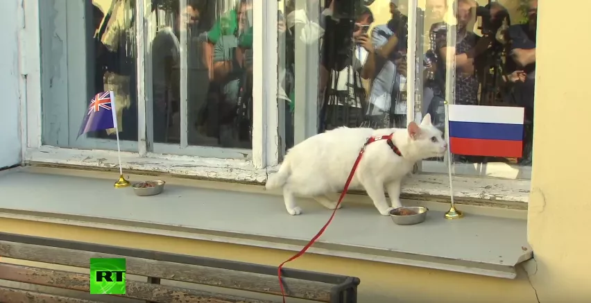 Чтобы указать победителя игры, кот должен был выбрать миску с кормом, обозначенную флагом одной из стран. Ахилл подошел к российскому флагу и лег рядом с ним, но еду пробовать не стал, передает RT.