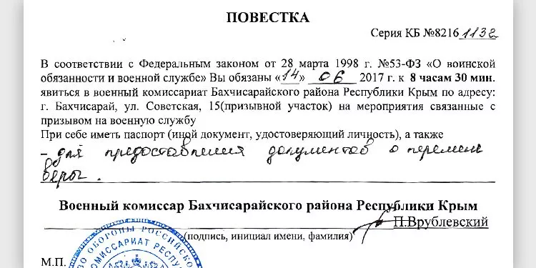 В двух повестках от призывника потребовали явиться в военкомат «для предоставления документов о перемене веры». В какую веру он должен перейти, где получить такие документы, не уточнили, но сказали, что в случае отказа он пойдет под суд.