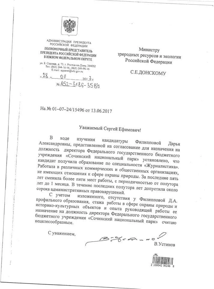 Полпред президента РФ в ЮФО Владимир Устинов направил письмо главе Минприроды Сергею Донскому с просьбой не назначать на должность директора нацпарка Сочи Дарью Филиппову