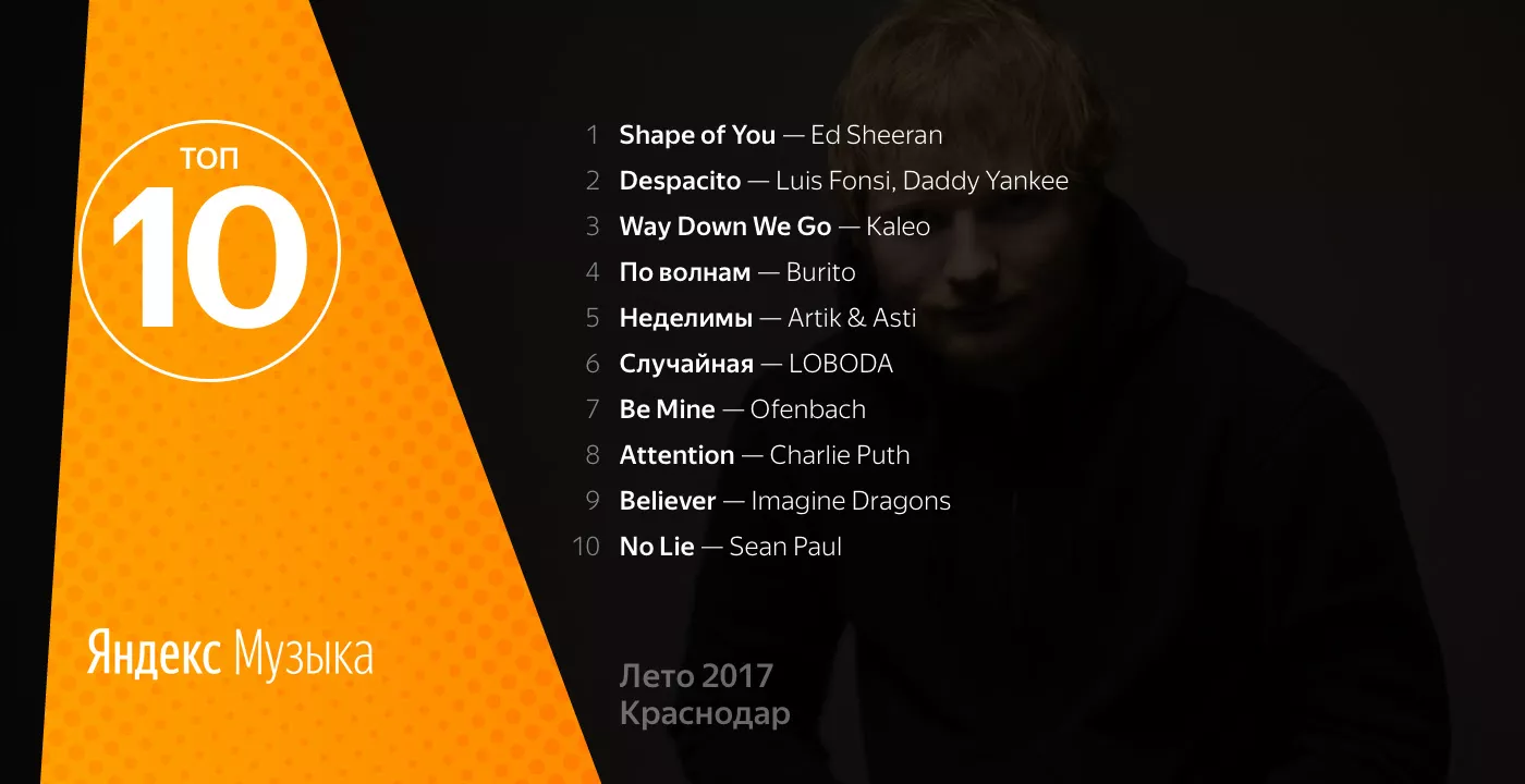 В десятку любимых треков вошли только три песни на русском языке — «По волнам» группы Burito, «Неделимы» группы Artik & Asti и «Случайная» певицы LOBODA. Возглавляет рейтинг композиция британского поп-исполнителя Ed Sheeran — Shape of You, сообщает пресс-служба «Яндекса».